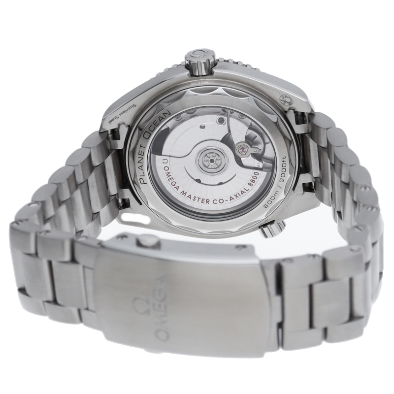 オメガの本格的なダイビングウォッチ「プラネットオーシャン」。60気圧 (600m/2000フィート)の防水性とヘリウムエスケープバルブ付属。タイムピースの心臓部にはオメガマスタークロノメーターキャリバー8800が搭載されており、シースルーケースバックから眺めることができます。