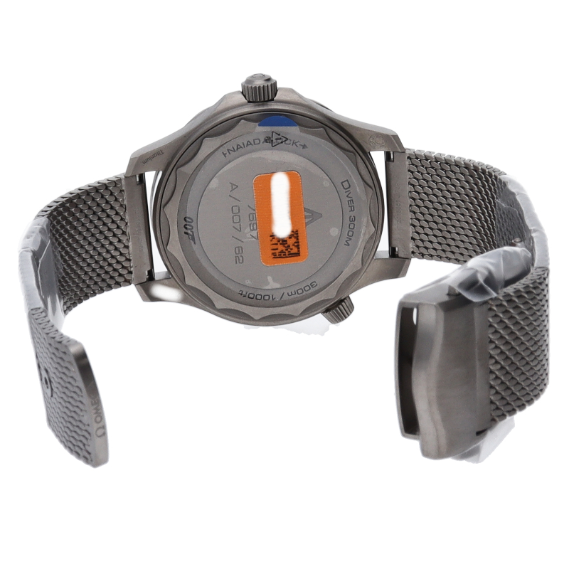映画007の「ノータイム トゥ ダイ」で実際にジェームズ・ボンドが着用するモデルと同一デザインが心をくすぐる一品。そのデザインにはダニエル・クレイグの意見が反映されており、劇中のジェームズ・ボンドが英国海軍中佐の設定ということもあり、文字盤の6時位置には英国軍官給品である事を示すブロードアローがプリントされており、裏蓋にも同様のエングレービングが施されています。