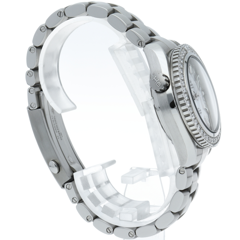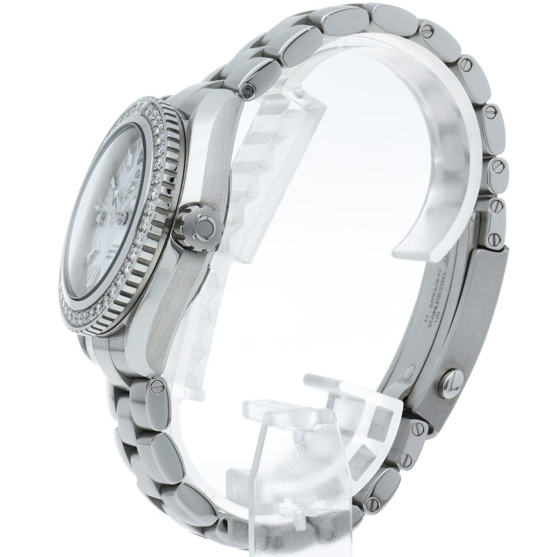 オメガのプロフェッショナルダイバーウォッチ「シーマスタープラネットオーシャン」。こちらはケース径37.5mmでベゼルにダイヤモンドをセッティングしたゴージャスなモデル。スポーティーながらドレッシーでエレガンスも感じさせる一本になっています。