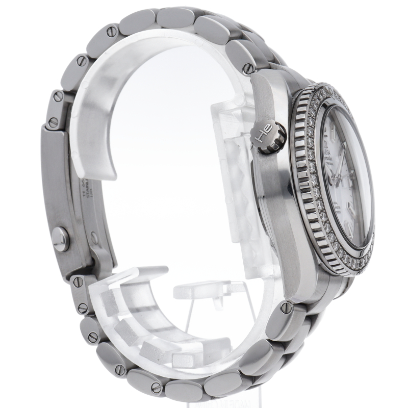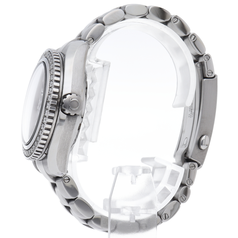 オメガのプロフェッショナルダイバーウォッチ「シーマスタープラネットオーシャン」。こちらはケース径37.5mmでベゼルにダイヤモンドをセッティングしたゴージャスなモデル。スポーティーながらドレッシーでエレガンスも感じさせる一本になっています。