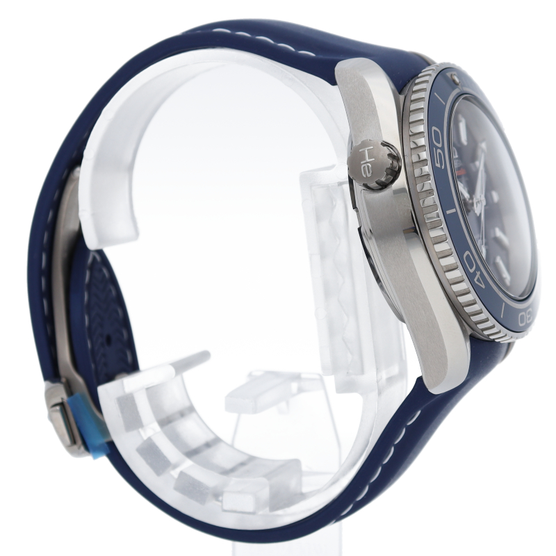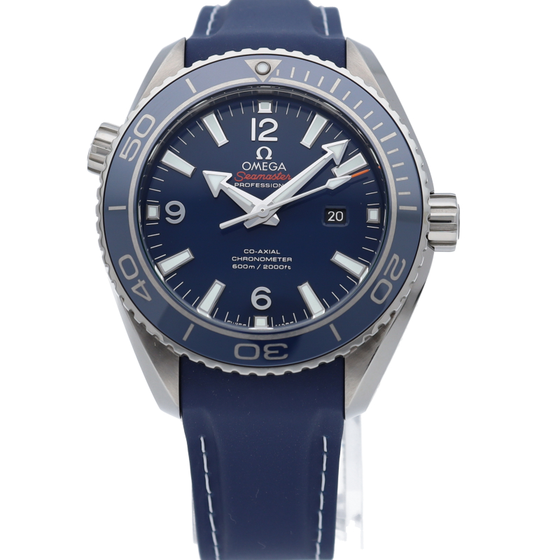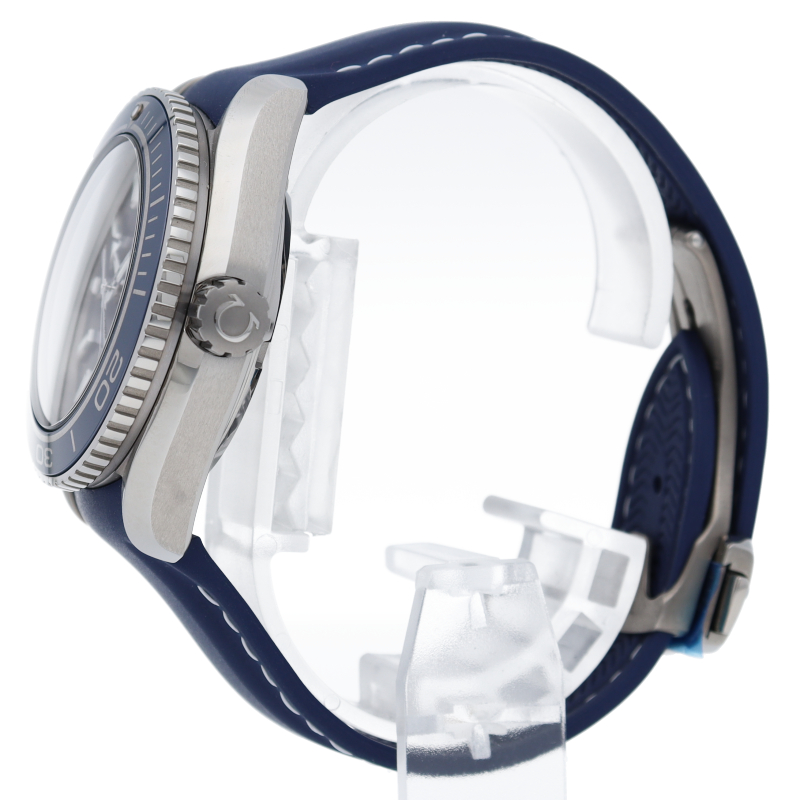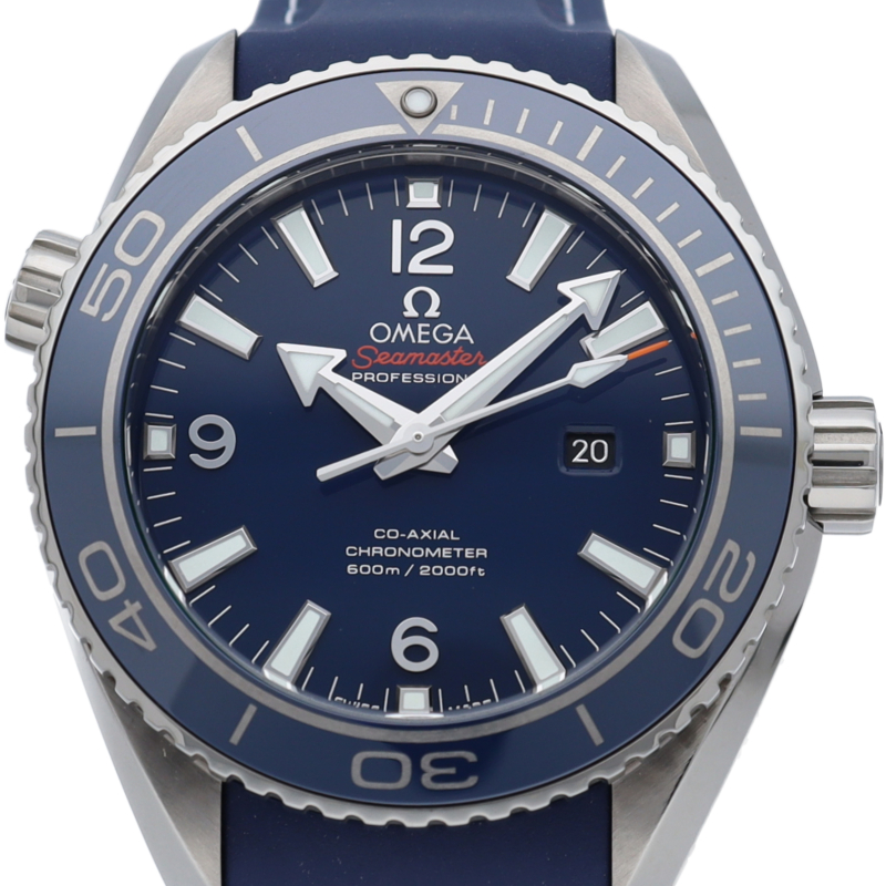 オメガの本格的なダイビングウォッチで「プラネットオーシャン」。600m防水性能を誇るチタンケースには、スポーティーなブルーのラバーストラップが装着され、信頼性の高いオメガ独自開発のコーアクシャルムーブメントを搭載しています。