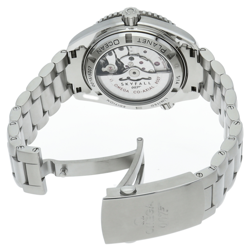 オメガの本格的なダイビングウォッチで「プラネットオーシャン」。ヘリウムエスケープバルブやコーアクシャル脱進機搭載。オメガ シーマスター プラネットオーシャン スカイフォール リミテッドエディション」は、マットブラックのダイアルに、3時位置の日付窓と7時位置の007のロゴが特徴です。世界5007本限定。