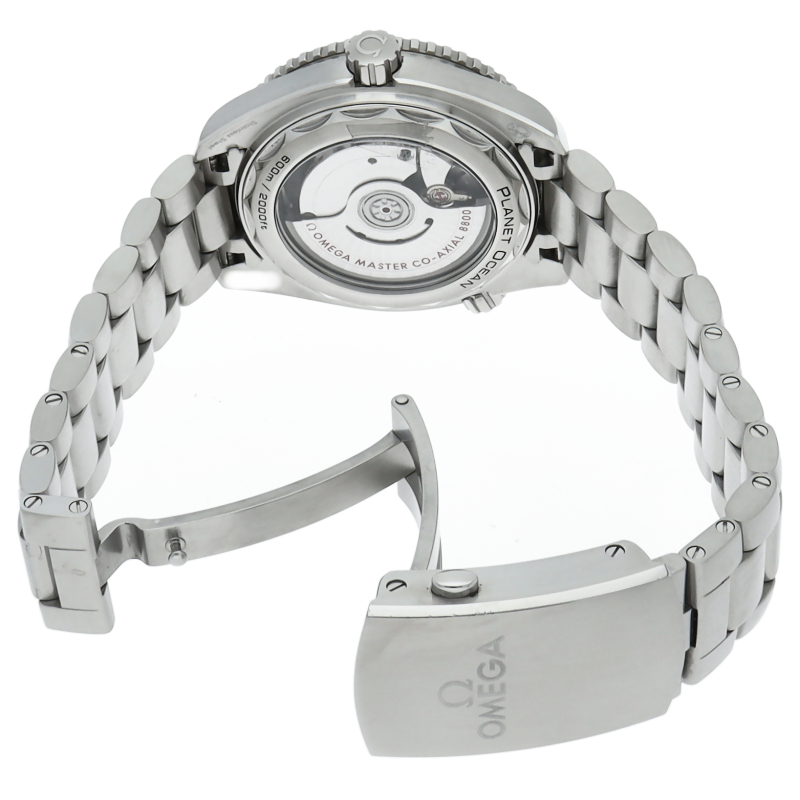 オメガの本格的なダイビングウォッチ「プラネットオーシャン」。60気圧 (600m/2000フィート)の防水性とヘリウムエスケープバルブ付属。タイムピースの心臓部にはオメガマスタークロノメーターキャリバー8800が搭載されており、シースルーケースバックから眺めることができます。