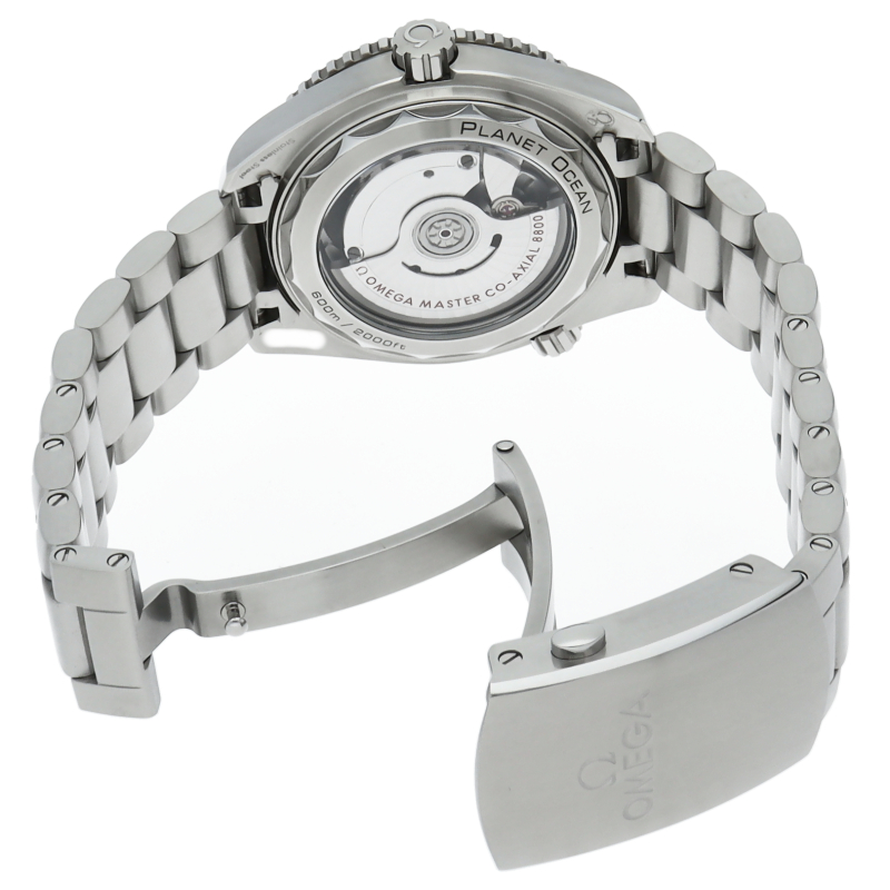 オメガの本格的なダイビングウォッチ「プラネットオーシャン」。60気圧 (600m/2000フィート)の防水性とヘリウムエスケープバルブ付属。タイムピースの心臓部にはオメガマスタークロノメーターキャリバー8800が搭載されており、シースルーケースバックから眺めることができます。