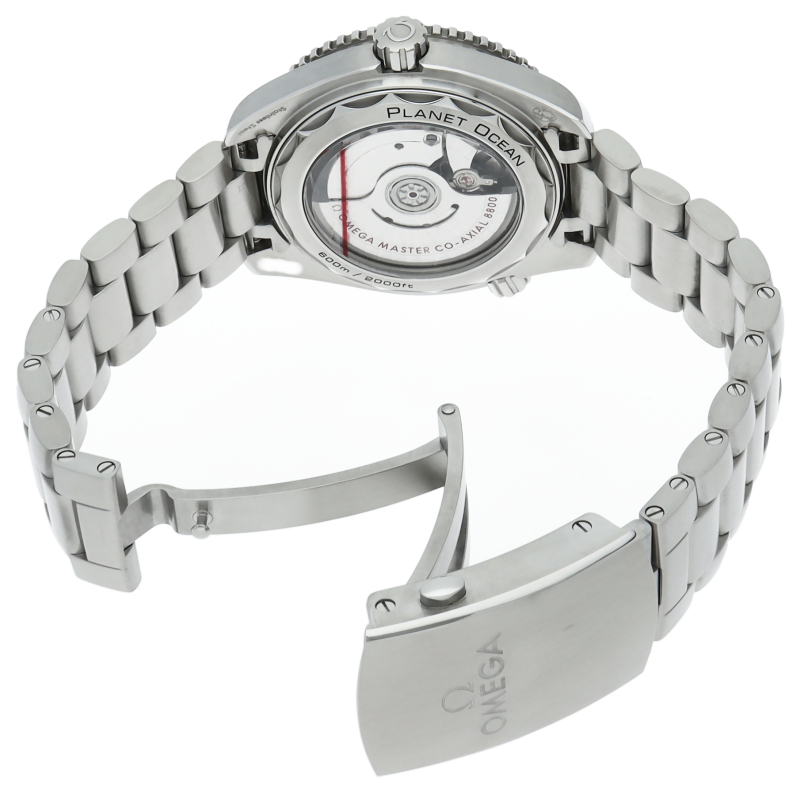 オメガの本格的なダイビングウォッチ「プラネットオーシャン」。60気圧 (600m/2000フィート)の防水性とヘリウムエスケープバルブ付属。タイムピースの心臓部にはオメガマスタークロノメーターキャリバー8800が搭載されており、シースルーケースバックから眺めることができます。