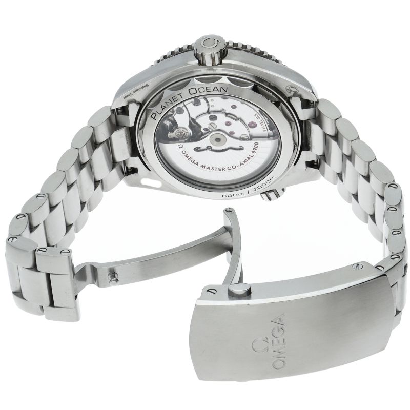 オメガの本格的なダイビングウォッチ「プラネットオーシャン」。ヘリウムエスケープバルブやコーアクシャル脱進機搭載。タイムピースの心臓部にはオメガマスタークロノメーターキャリバー8900が搭載されており、シースルーケースバックから眺めることができます。