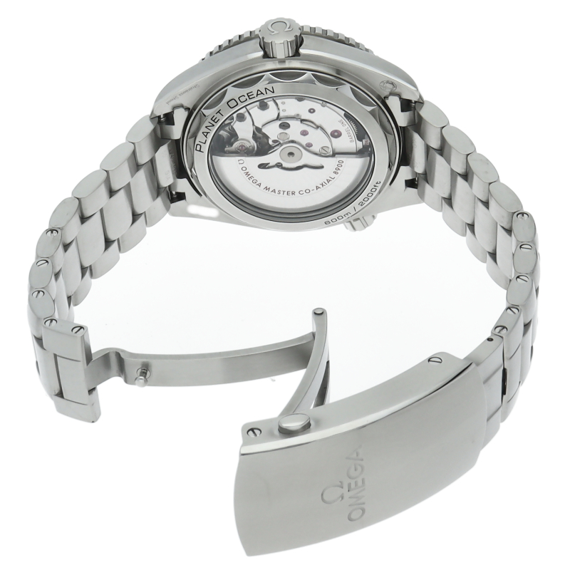 オメガの本格的なダイビングウォッチ「プラネットオーシャン」。60気圧 (600m/2000フィート)の防水性とヘリウムエスケープバルブ付属。タイムピースの心臓部にはオメガマスタークロノメーターキャリバー8900が搭載されており、シースルーケースバックから眺めることができます。