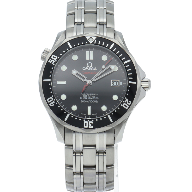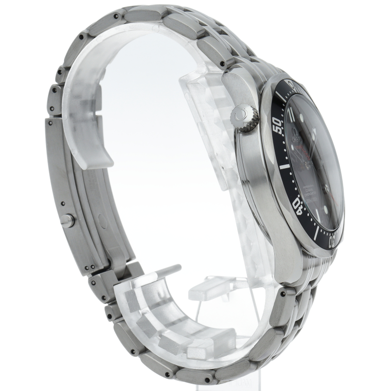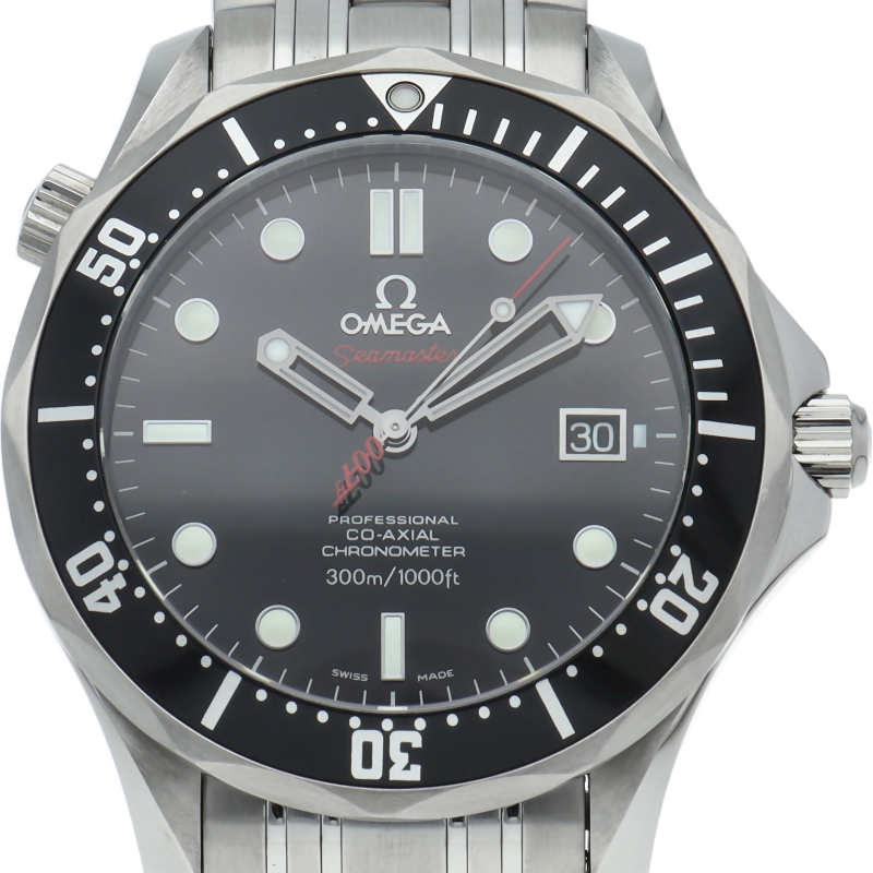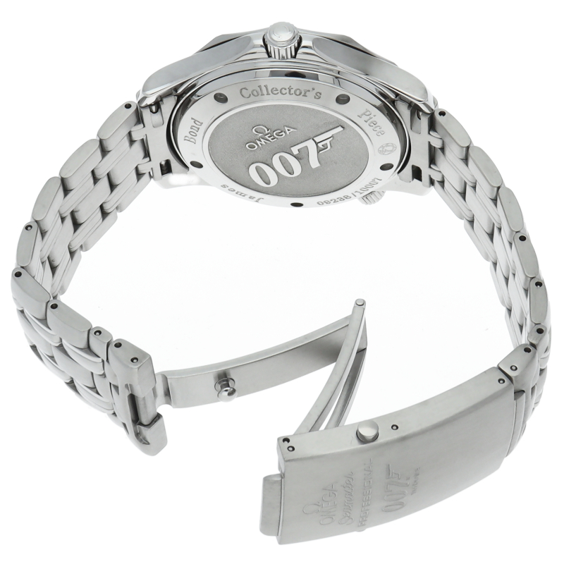 シーマスターの2008年度の「007」リミテッドモデルです。この年はブラックダイヤルに007をあしらった針が特徴です。オメガのフラッグシップモデルであるシーマスターコレクション。ケースサイド10時には飽和潜水時のヘリウムガスによる風防破損事故を防ぐヘリウム・エスケープバルブ。潜水時間を計測できる逆回転防止付き回転ベゼルを備えており、機能性の高い逸品です。