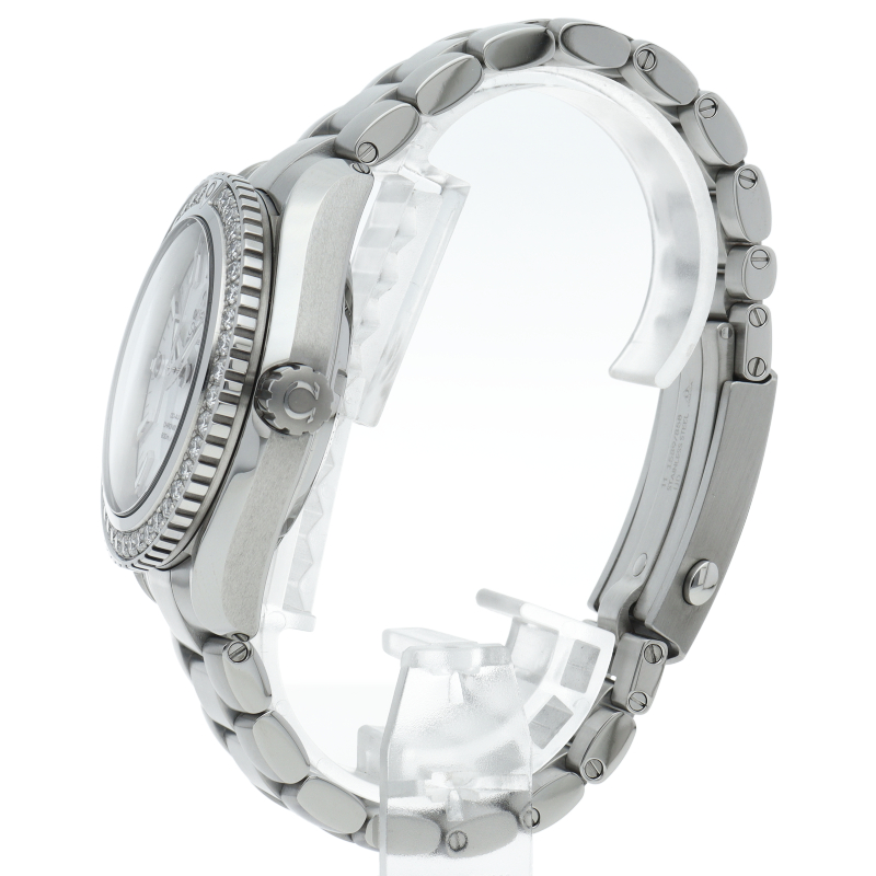 傷の付きにくいサファイア・クリスタル ガラスを採用したこのモデルは、ホワイトダイアルに、3時位置の日付窓が特徴です。ダイヤモンドがセットされた逆回転防止ベゼルは、ステンレススティール製ブレスレットが付いた、直径42mmのステンレススティール製ケースに取り付けられています。