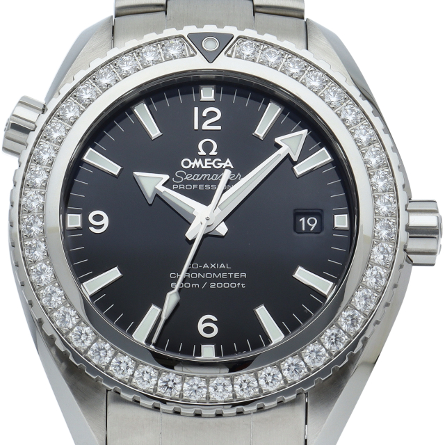 オメガのプロフェッショナルダイバーウォッチ「シーマスタープラネットオーシャン」。こちらはケース径45.5mmでベゼルにダイヤモンドをセッティングしたゴージャスなモデル。スポーティーながらドレッシーでエレガンスも感じさせる一本になっています。
