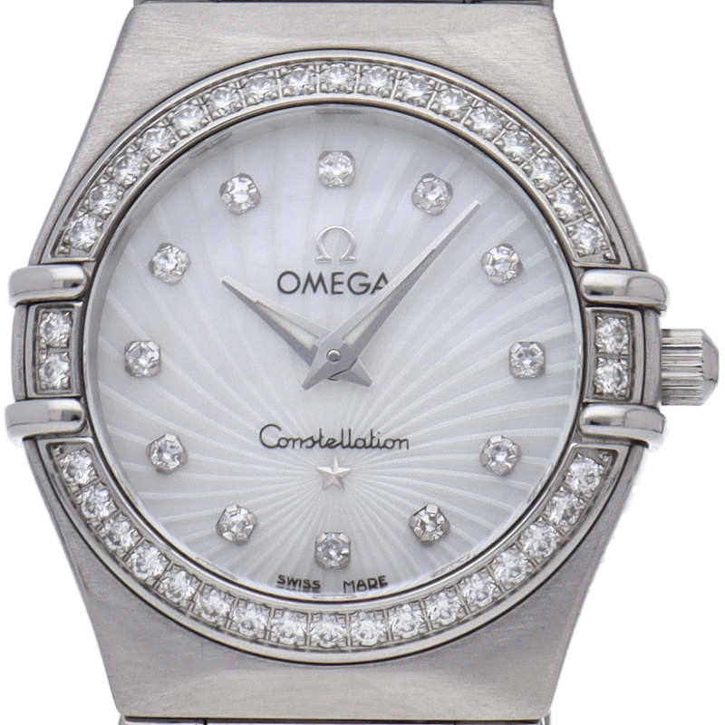 オメガを代表するドレスウォッチ「コンステレーション」。こちらはオメガの誕生から160年を記念して作られたモデルです。放射線線状に立体加工されたシェル文字盤にインデックスとベゼルにはダイヤがセッティングされ、高級感を演出しています。