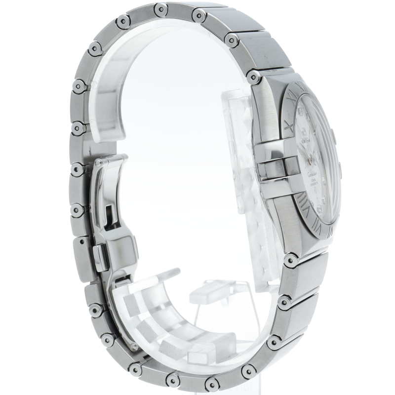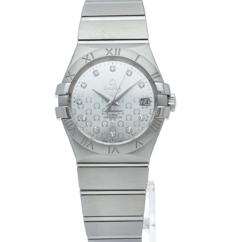 艶無しオールシルバーのボディに煌めくダイヤインデックスやオメガロゴ入り文字盤が浮かび、ローマン文字が彫られた4本の爪をモチーフとしたベゼルが存在感を魅せるコンステレーションです。フェイスではサテンの艶めきとともにオメガロゴが主張し、蛍光塗料を施した指針は視認性に富みます。シンプルな機能を魅せ、35mmサイズがしっくりとフィットし時を刻みます。