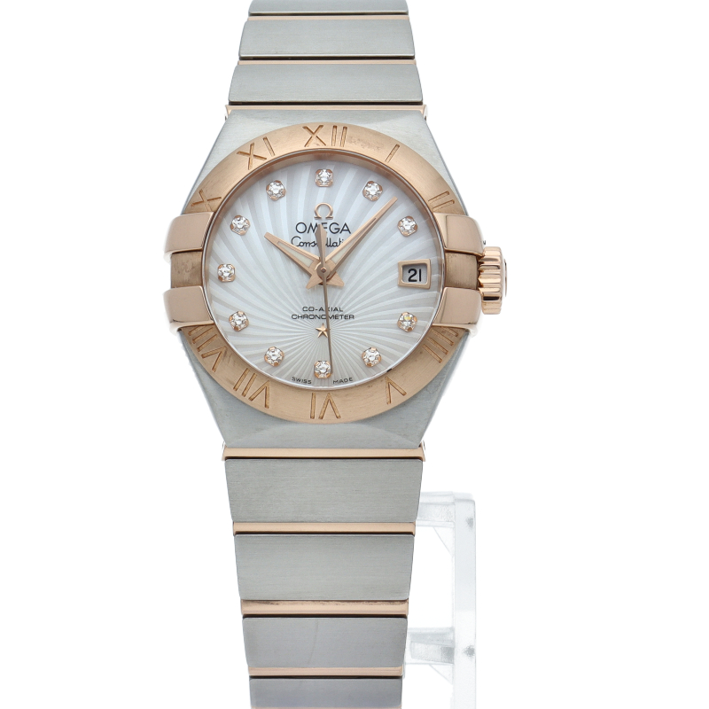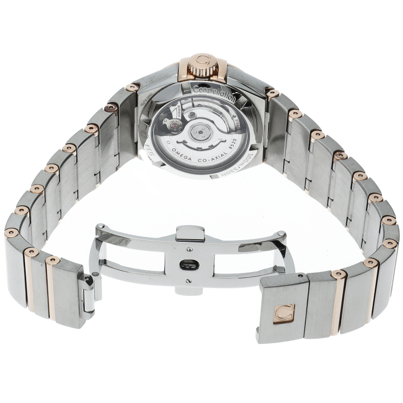 オメガの人気モデル「コンステレーション」の新作モデルが入荷しました。こちらのモデルは、電池式のクォーツムーブメントではなく、自動巻きコーアクシャルムーブメントを搭載しております。ケースはバックスケルトンになっており、中の機械をみる事ができます。3時位置にはデイト表示を備えています。