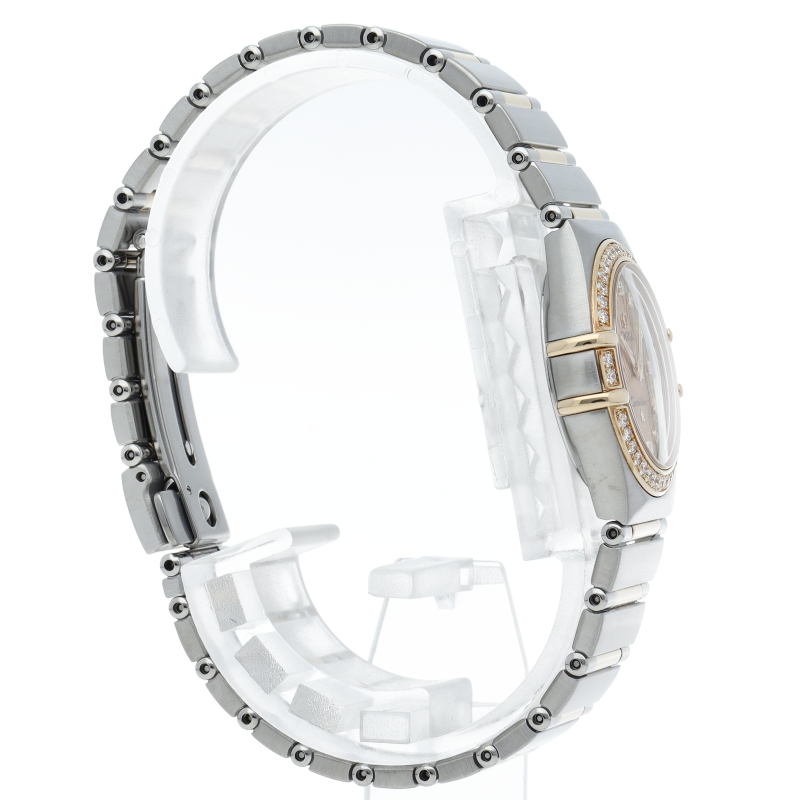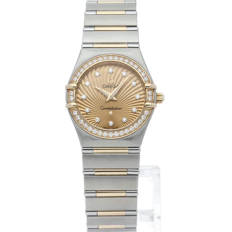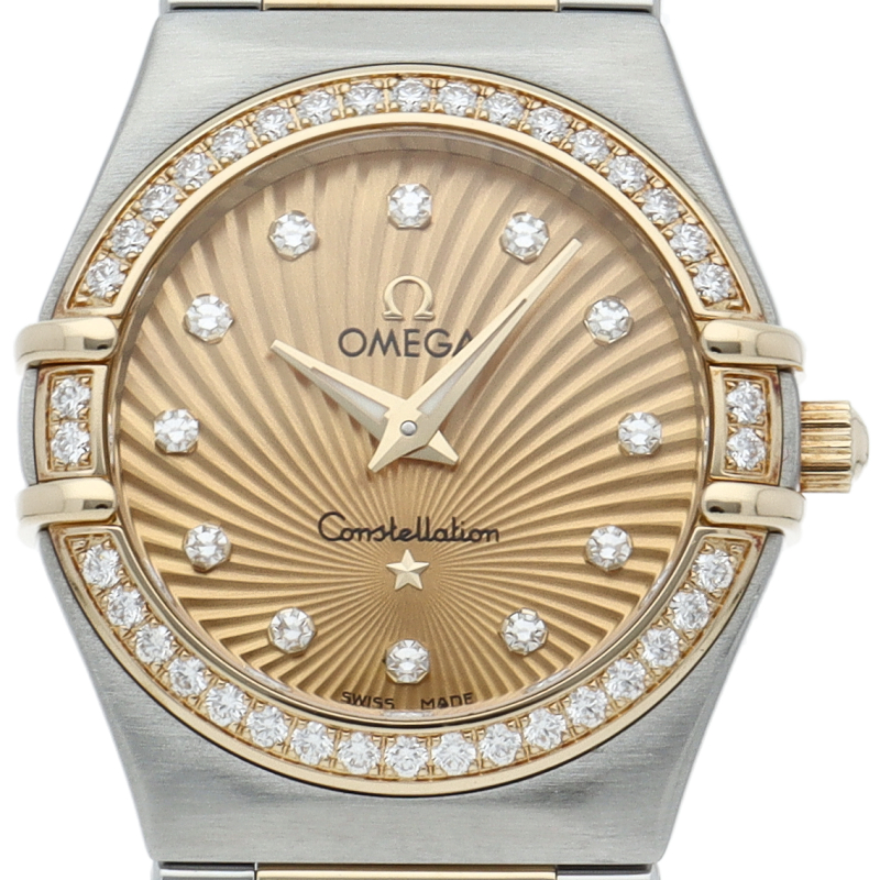 オメガの創立160周年を記念して発売された「コンステレーション・ミニ 」。シャンパンゴールドのダイヤルには、コンステレーションを象徴する6時位置の星から放射状のラインが広がり、奥行きのあるデザインとなっています。ダイヤモンドがベゼルに散りばめられていますが、華美な印象はなく、日常的にお使いいただけるのではないでしょうか。