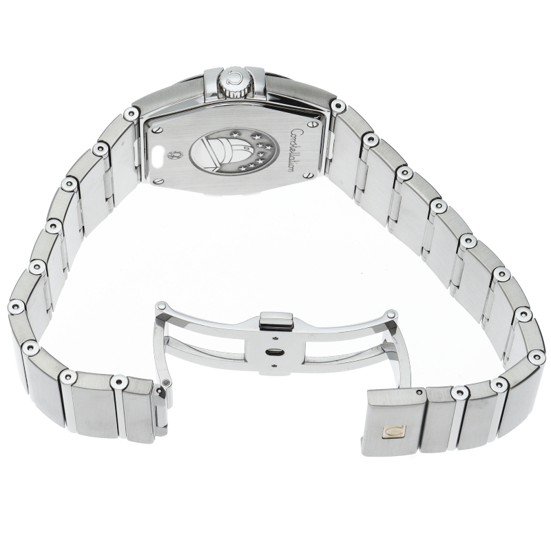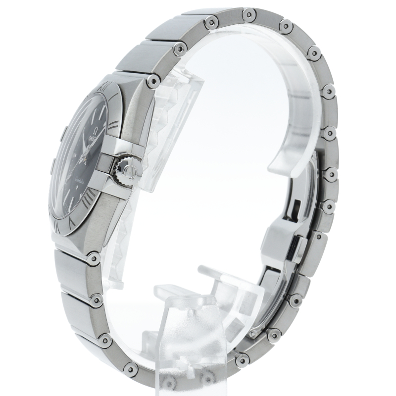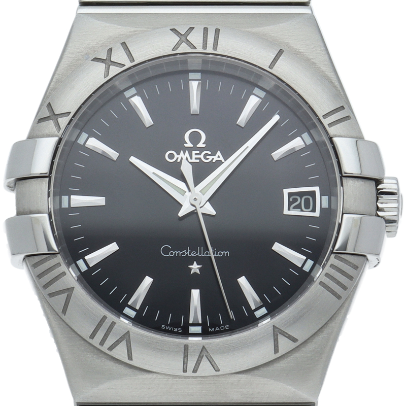 オメガの「コンステレーション」コレクションは不朽のデザインコンセプトを備え、有名な「爪」と印象的なダイアルが特徴です。ブラックダイアルの3時位置には日付窓が配置され、傷の付きにくいサファイア・クリスタルガラスを採用。ローマ数字が刻印されたべゼルとステンレススティール製ブレスレットが取り付けられています。