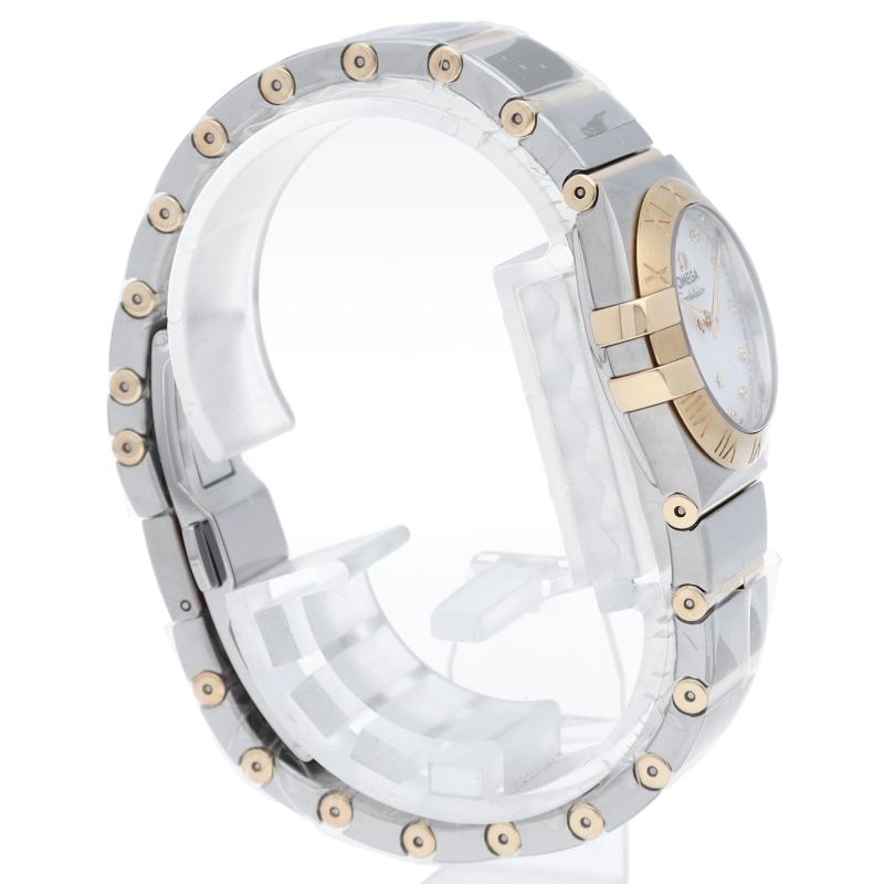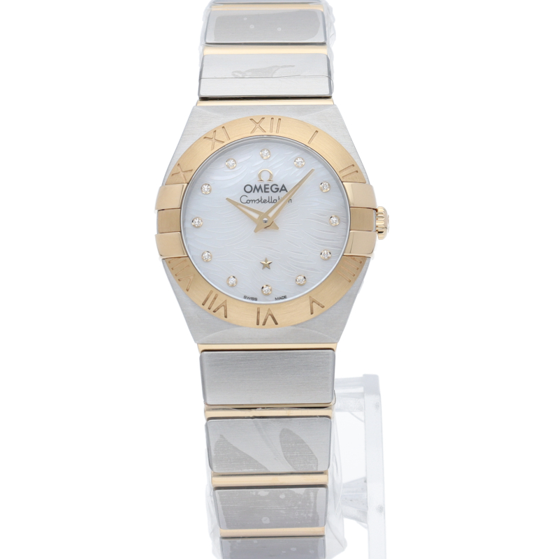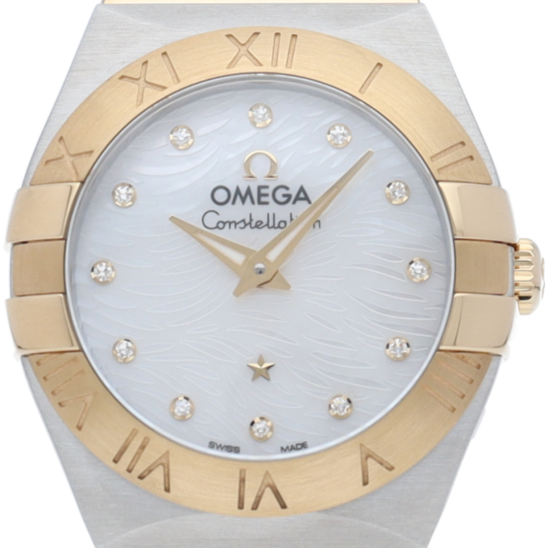 オメガを代表するドレスウォッチ「コンステレーション」。このモデルのホワイトマザーオブパールのダイアルには、アイコン的な「爪」の間に揺らめく波模様が刻印され、ダイアルには12個のダイヤモンド インデックスが配置されています。クォーツ キャリバー1376を搭載。