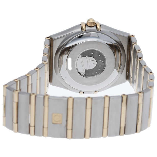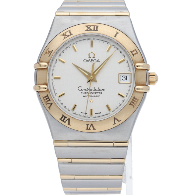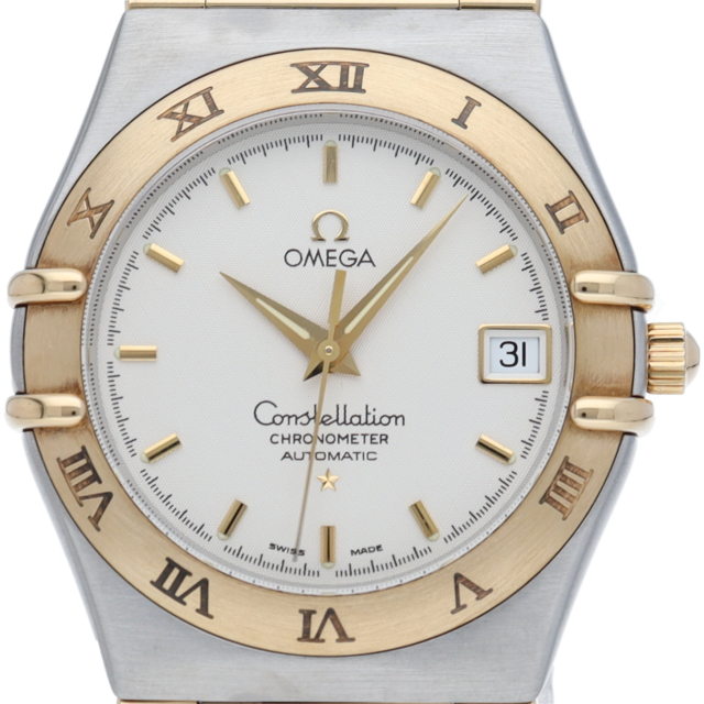 オメガを象徴する人気コレクション「コンステレーション」です。ステンレスとイエローゴールドのフルバーの組み合わせがゴージャスな印象のデザインです。