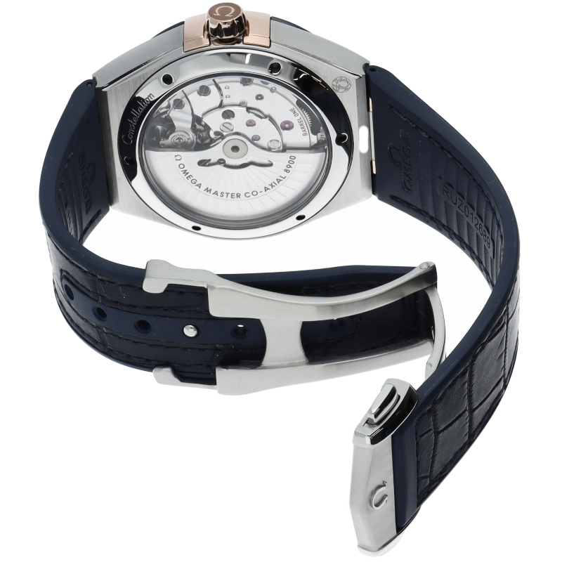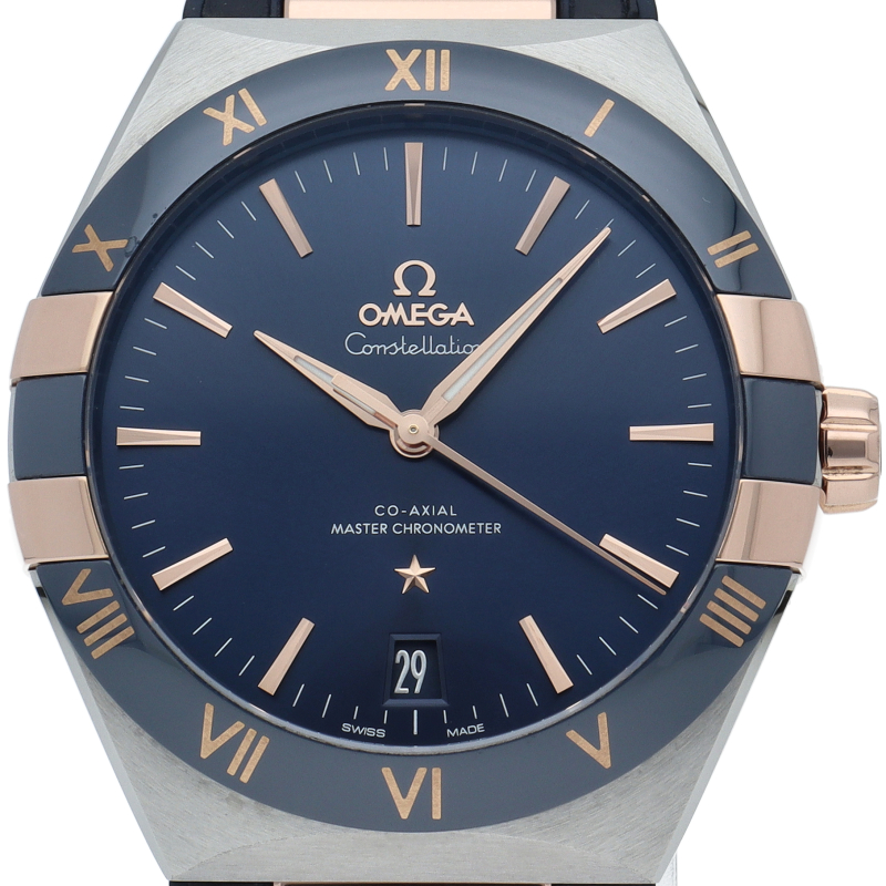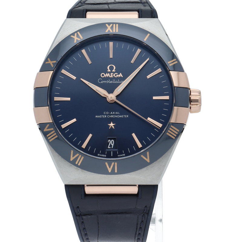1952年より続くオメガの最高級ライン「コンステレーション」。このモデルはセラゴールド技術によるローマ数字を配したポリッシュ仕上げのブルーセラミック製ベゼルが印象的で、サンブラッシュ仕上げのブルーダイアルには、6時位置に日付窓があります。針、オメガロゴ、コンステレーションの「星」、ファセット加工のインデックスにはいずれも18Kセドナゴールドが使用されています。