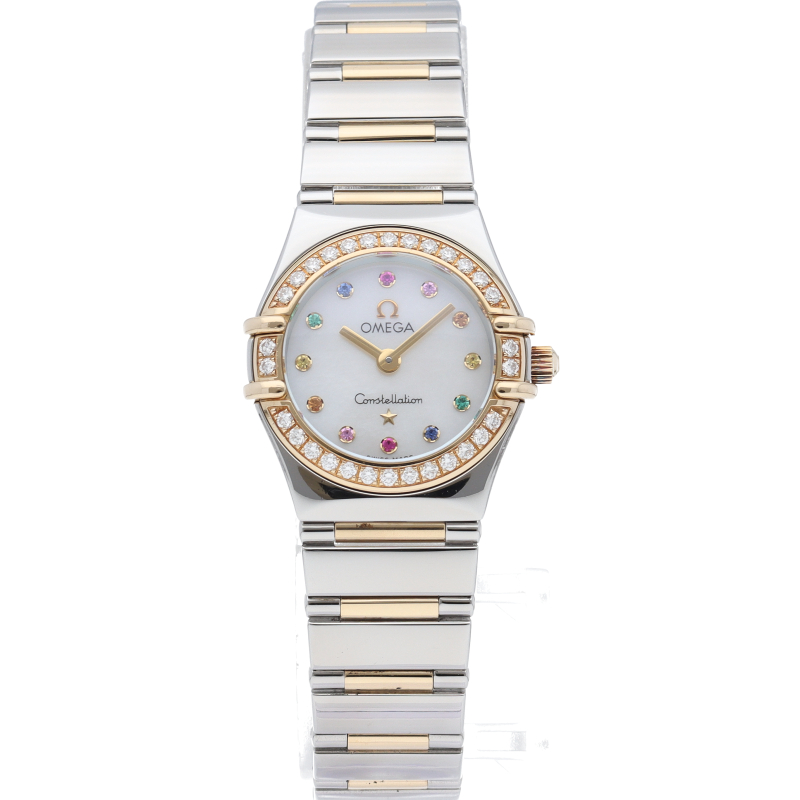 ギリシア神話“虹の女神イリス”をモチーフとしたコンステレーション「アイリス」。マザー・オブ・パールの文字盤には6色の輝石(ルビー、ピンクサファイア、マンダリンガーネット、イエローサファイア、エメラルド、ブルーサファイア)がセットされ、さらにベゼルのダイヤモンドが女性の手元を華やかに彩ります。生産終了後はさらに人気となり、市場での出回りも少ないモデルとなっています。
