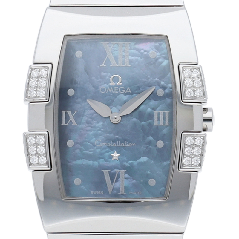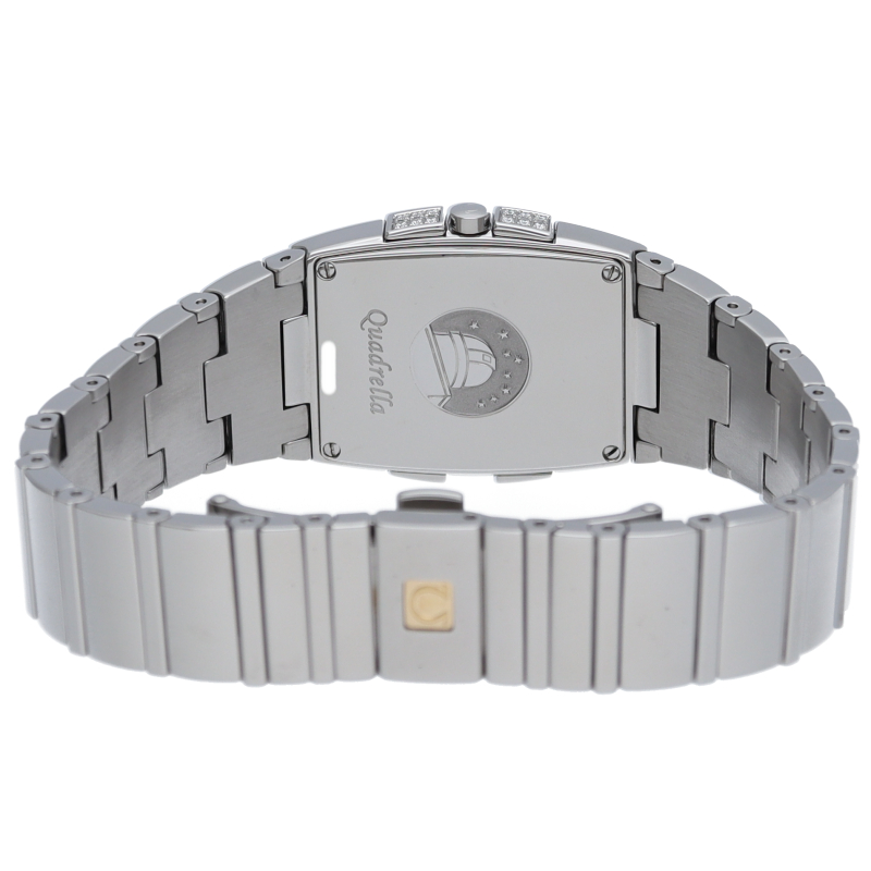 トノー(樽)型のケースに、様々な宝石がセッティングされたインデックスが特徴の「オメガ コンステレーション クアドレラ」。マザーオブパールのダイヤルは光によりキラキラと輝きます。6時位置には星座を意味するコンステレーションの証である星のマーク。コンステレーション伝統の4つの爪にはダイヤが施されており、華やかな印象を一段と引き立たせます。