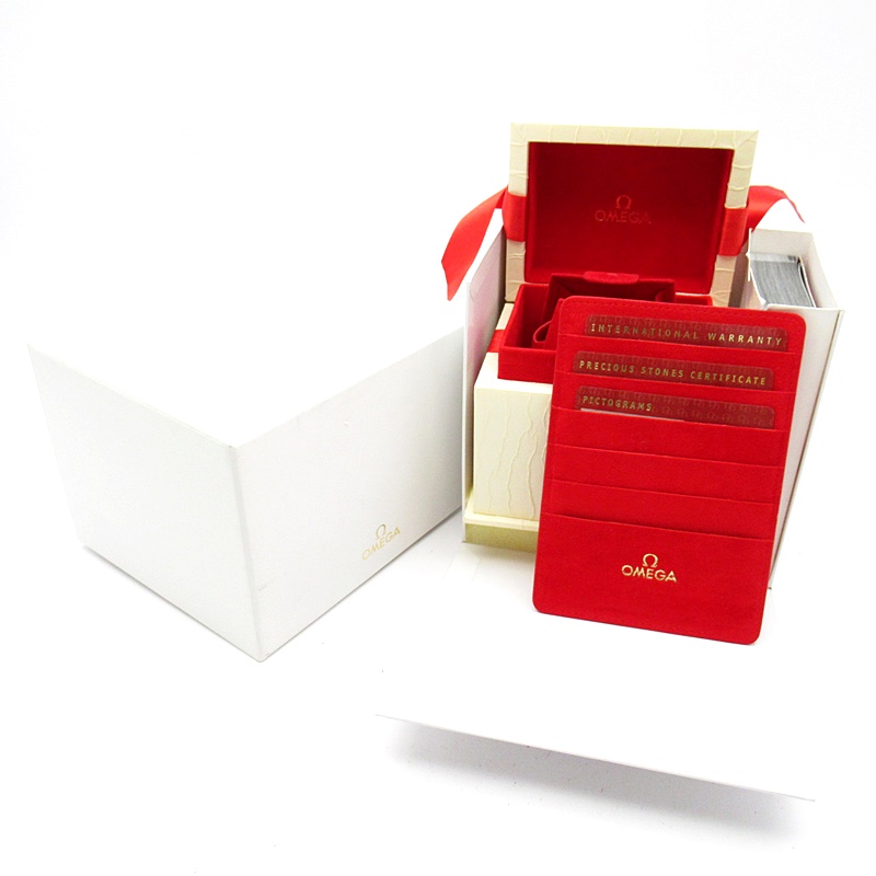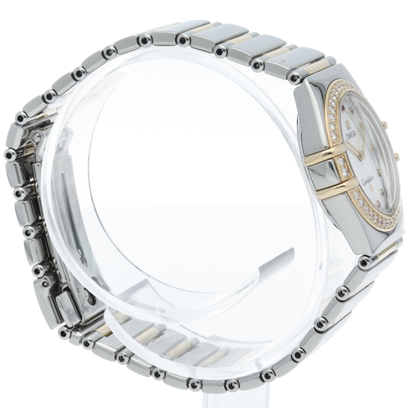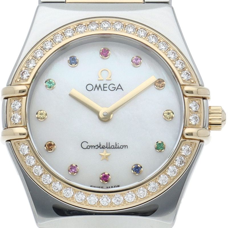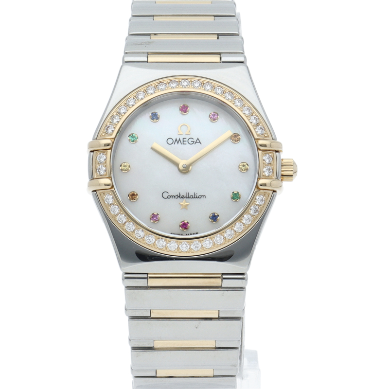 オメガを代表するドレスウォッチ「コンステレーション」。虹色の色彩7種類の宝石を配置した、カラフルで可愛さのあるドレスウォッチ。ベゼルにはダイヤが施された高級感溢れる1本。