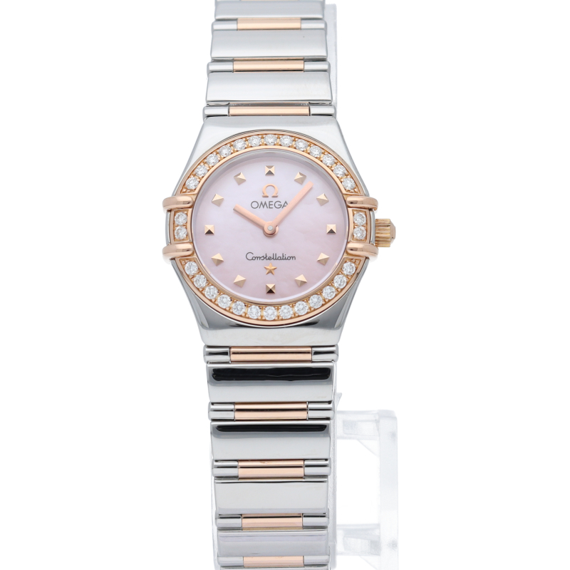 オメガを代表するドレスウォッチ「コンステレーション」。ベゼルに30個のダイヤを配したラグジュアリーなモデルです。ピンクシェルの文字盤はダイヤモンドとの相性も抜群です。可愛らしいミニサイズ。