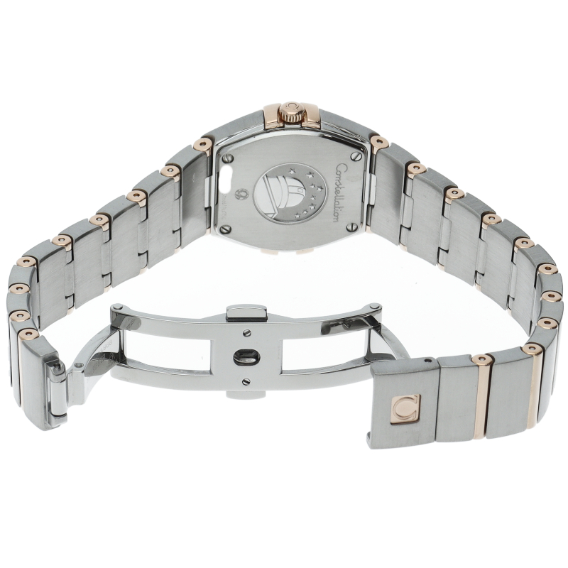 オメガの人気モデル、コンステレーションダブルイーグルのデザインを継承し、ブレスレットの構造が変更されております。 ブレスレットの構造は従来のコンステレーションのような、しなやかな造りとなりました。 文字盤にはホワイトシェルを使用しており、インデックスのダイヤモンドはより高級感が感じられます。