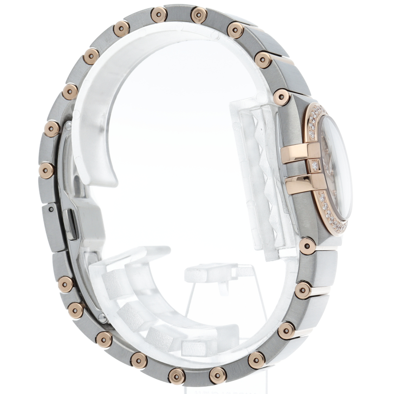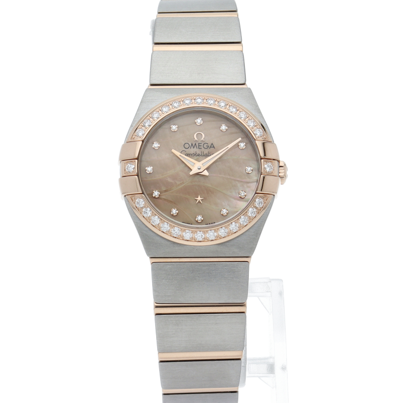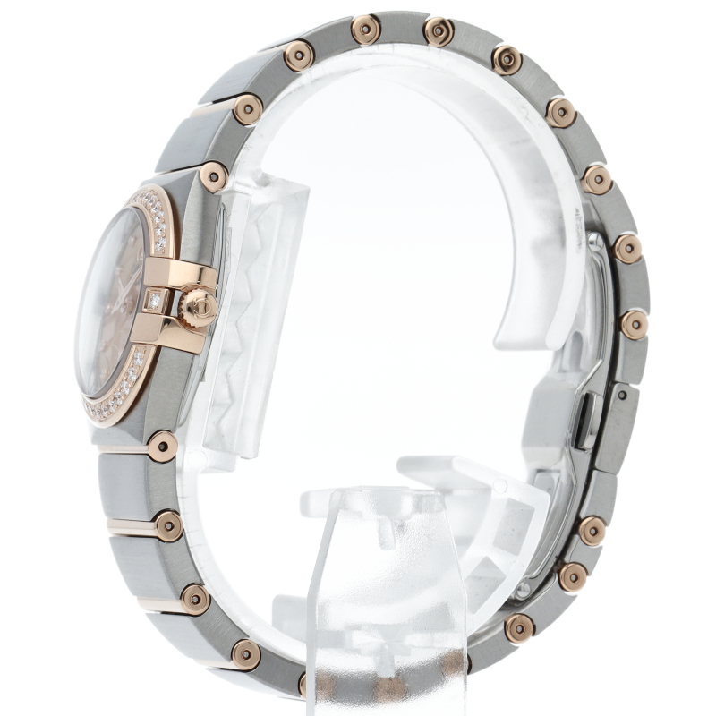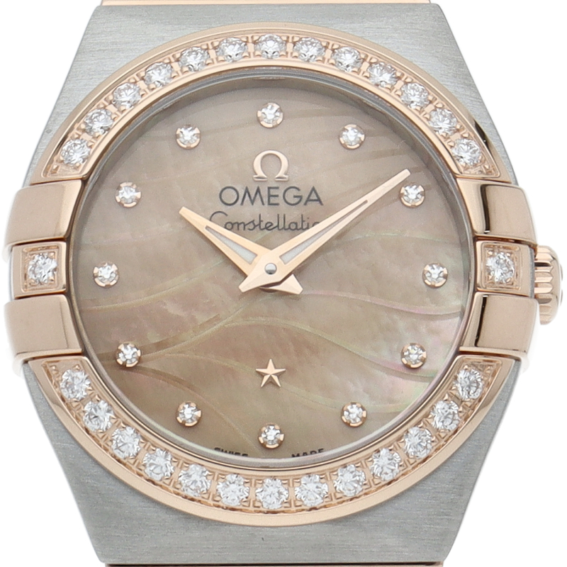 オメガを代表する最もオーソドックスでドレッシーなデザインの“コンステレーション”。全モデルがクロノメーター認定を受けた高精度コレクションです。こちらは素材にステンレススティールとピンクゴールドを使用し、全体にブラッシュ仕上げを施しました。ベゼルとインデックスにダイヤを配し、華やかなデザインに仕上がっています。