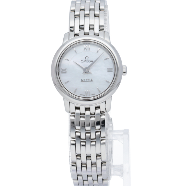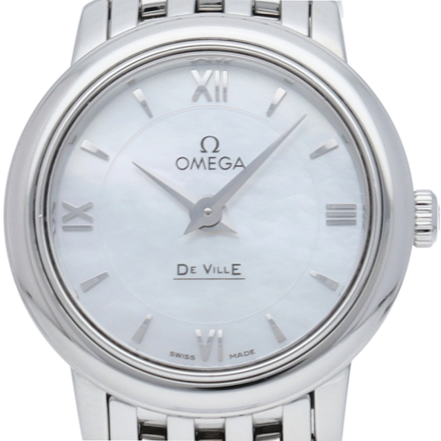 「デ・ヴィル プレステージ」コレクションは、そのクラシカルでエレガントなデザインが、多くのオメガ愛好家を惹きつけています。豪華な仕上げとタイムレスなデザインを備えたシンプルなスタイルが特徴です。2つのゾーンに分かれたホワイトマザーオブパールのダイアルには、3時、6時、9時、12時位置にローマ数字のアワーインデックスが付属しており、傷の付きにくいサファイアクリスタルガラスで保護されています。