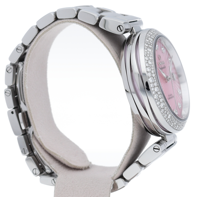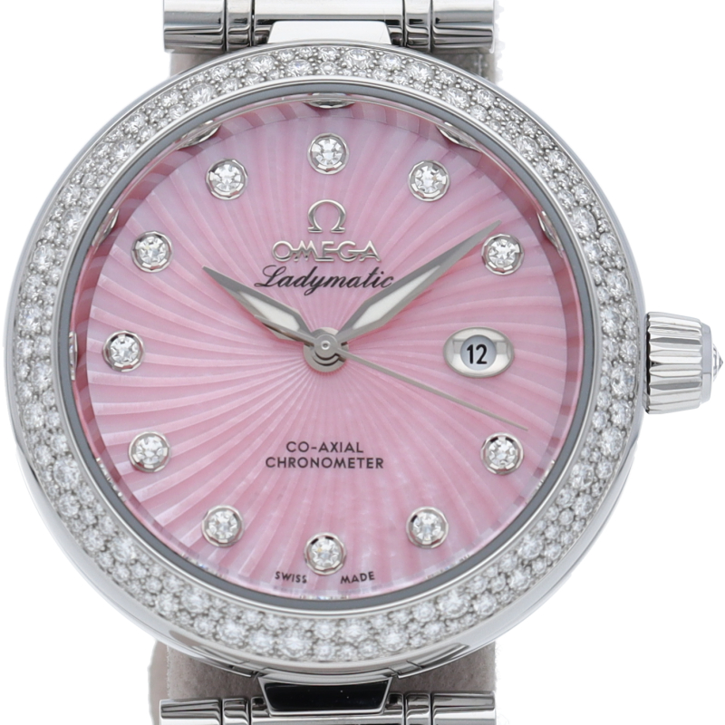 自動巻きムーブメントを搭載した本格派の「レディーマティック」。 ボリューム感のある立体的なラウンドケースが最大の特徴です。文字盤にはピンクシェルを使用しインデックス、ベゼルにはダイヤが施された豪華なモデルです。