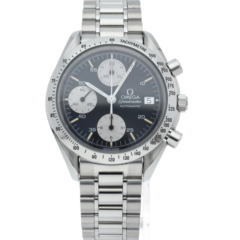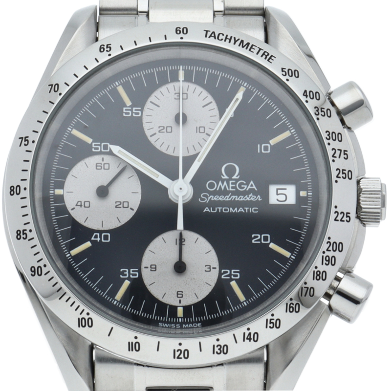 オメガの代表的な人気シリーズ「スピードマスター・デイト」。クロノグラフ・デイト表示機能付きと便利で実用性のある1本です。