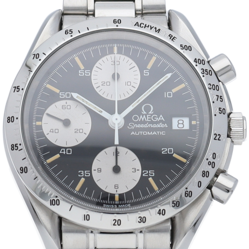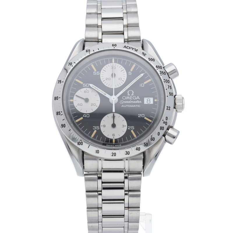 オメガの代表的な人気シリーズ「スピードマスター・デイト」。クロノグラフ・デイト表示機能付きと便利で実用性のある1本です。