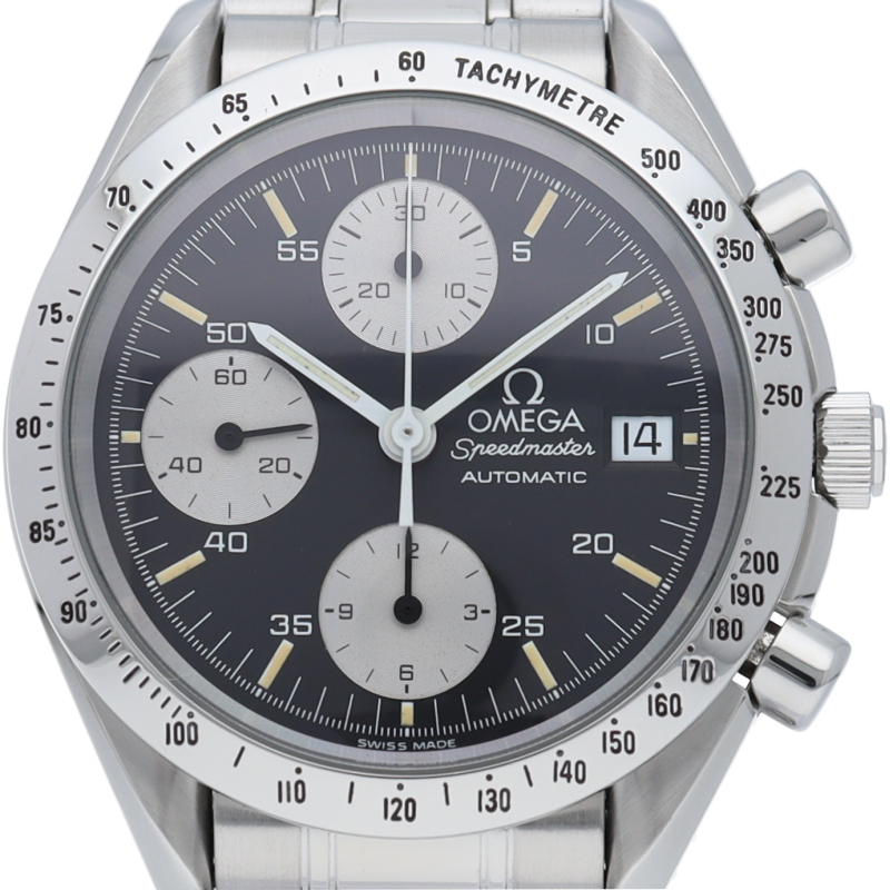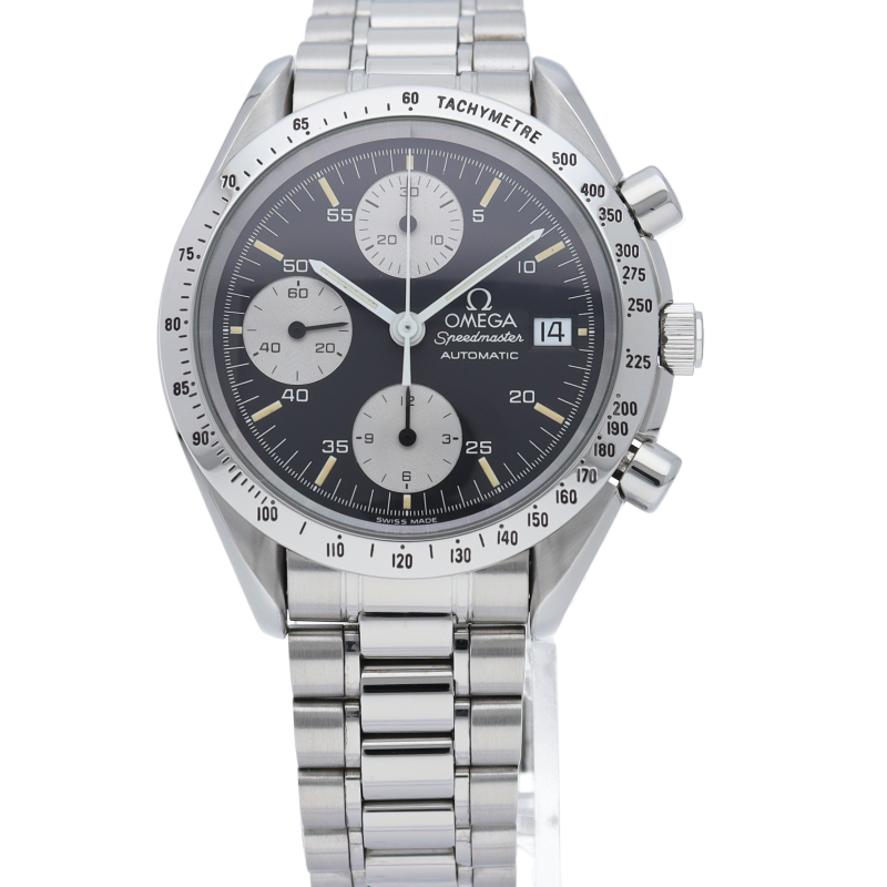 オメガの代表的な人気シリーズ「スピードマスター・デイト」。クロノグラフ・デイト表示機能付きと便利で実用性のある1本です。