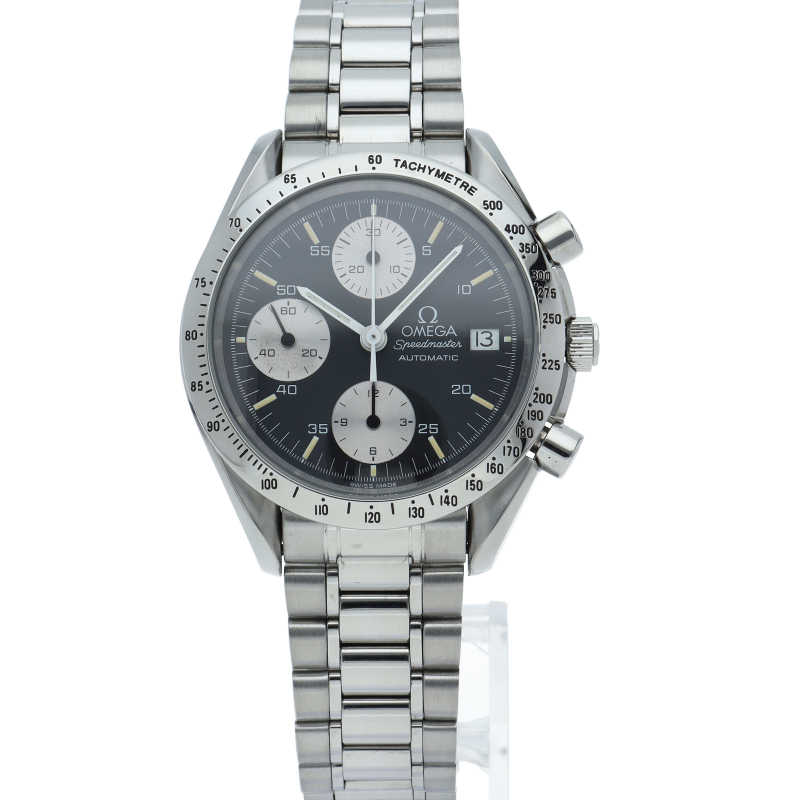 オメガの代表的な人気シリーズ「スピードマスター・デイト」。クロノグラフ・デイト表示機能付きと便利で実用性のある1本です。