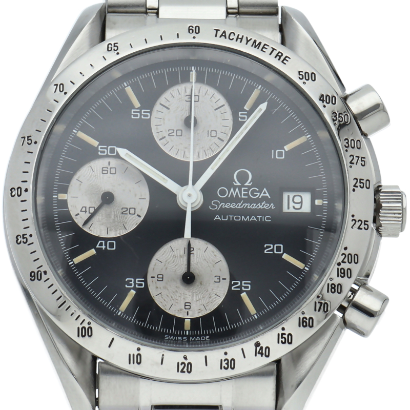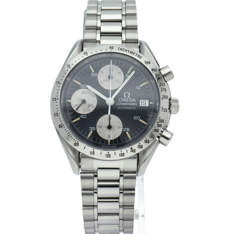 オメガの代表的な人気シリーズ「スピードマスター・デイト」。クロノグラフ・デイト表示機能付きと便利で実用性のある1本です。