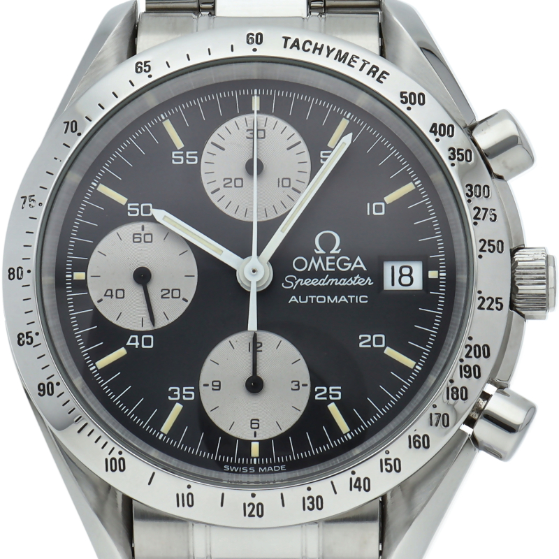 オメガの代表的な人気シリーズ「スピードマスター・デイト」。クロノグラフ・デイト表示機能付きと便利で実用性のある1本です。