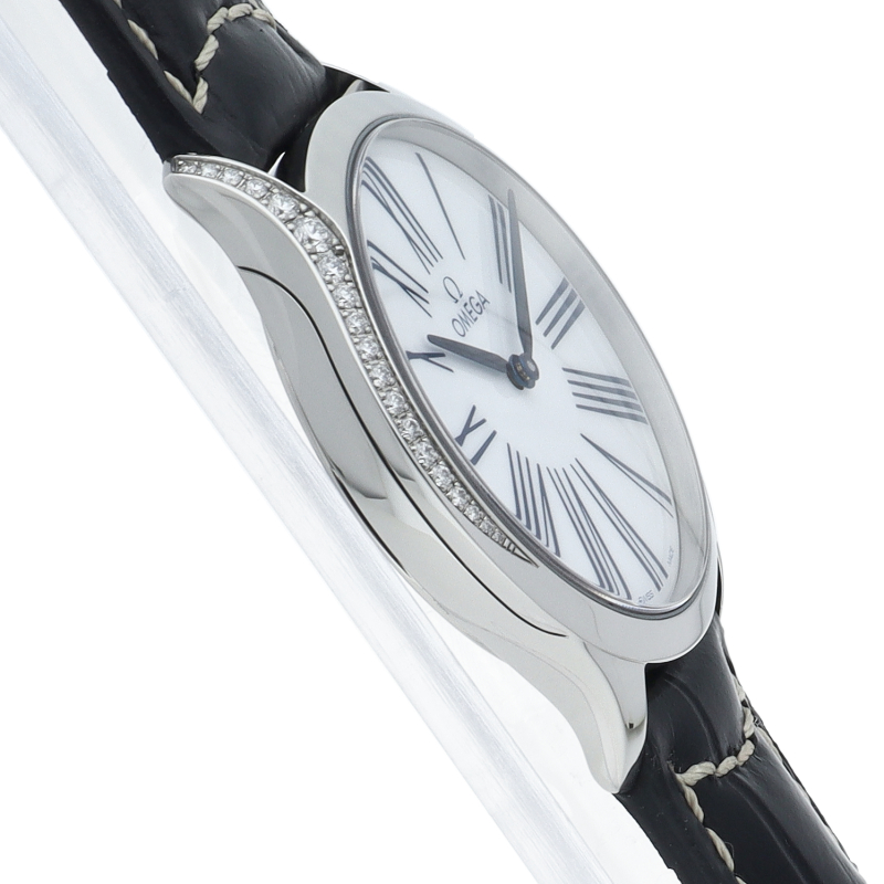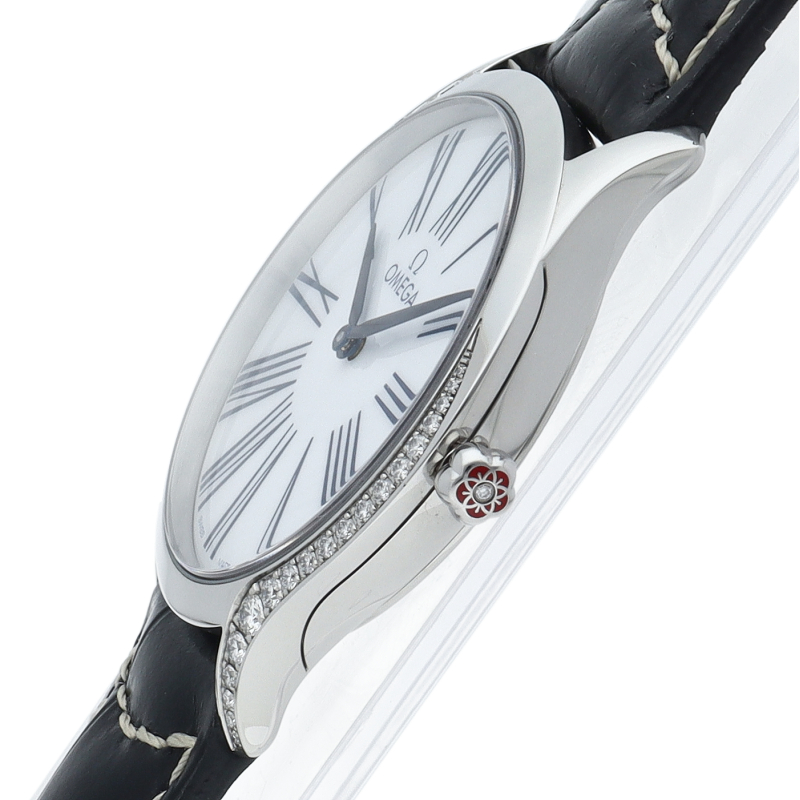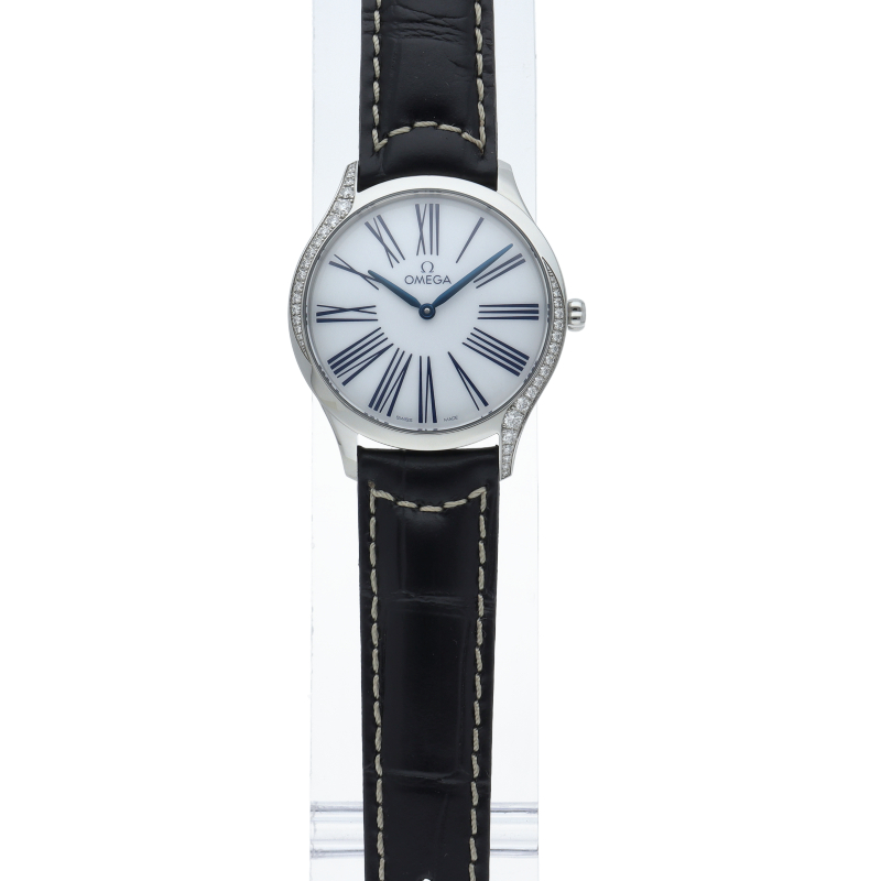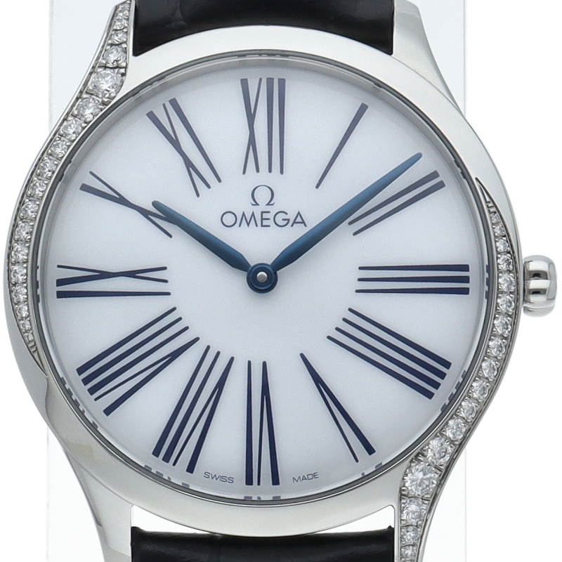 オメガのデ・ヴィルコレクションに新たに加わったモデル トレゾア。 ケース径は36ミリ。リューズにダイヤモンドとベゼルからラグにかけて施されたダイヤモンドが特徴です。