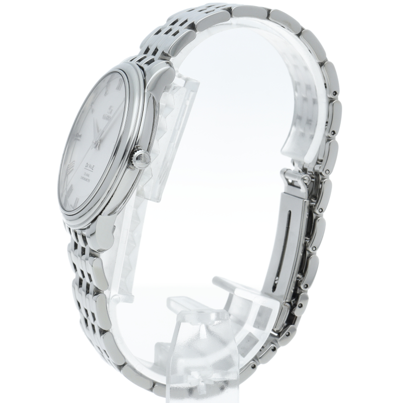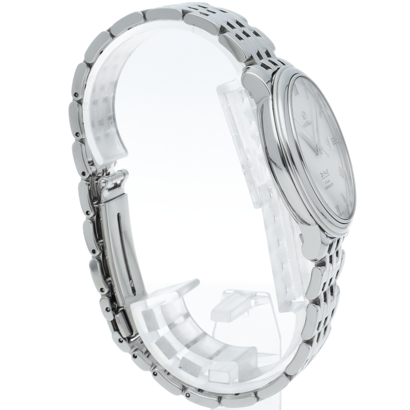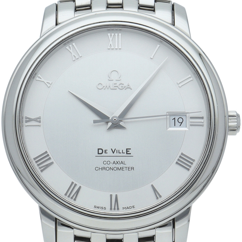 プレーンでオーソドックスなデザインの「デ・ヴィル プレステージ」。こちらはアワーインデックスにアプライドのローマインデックスを用いた文字盤でドルフィン針と共に伝統的なスタイルを継承しています。こちらはオメガの誇るコーアクシャルムーブメント搭載モデルで、シンプルで飽きの来ないデザインですので、長くお使いになるには最適なモデルではないでしょうか。