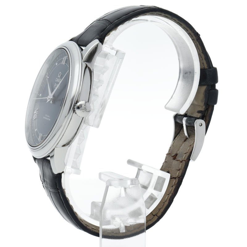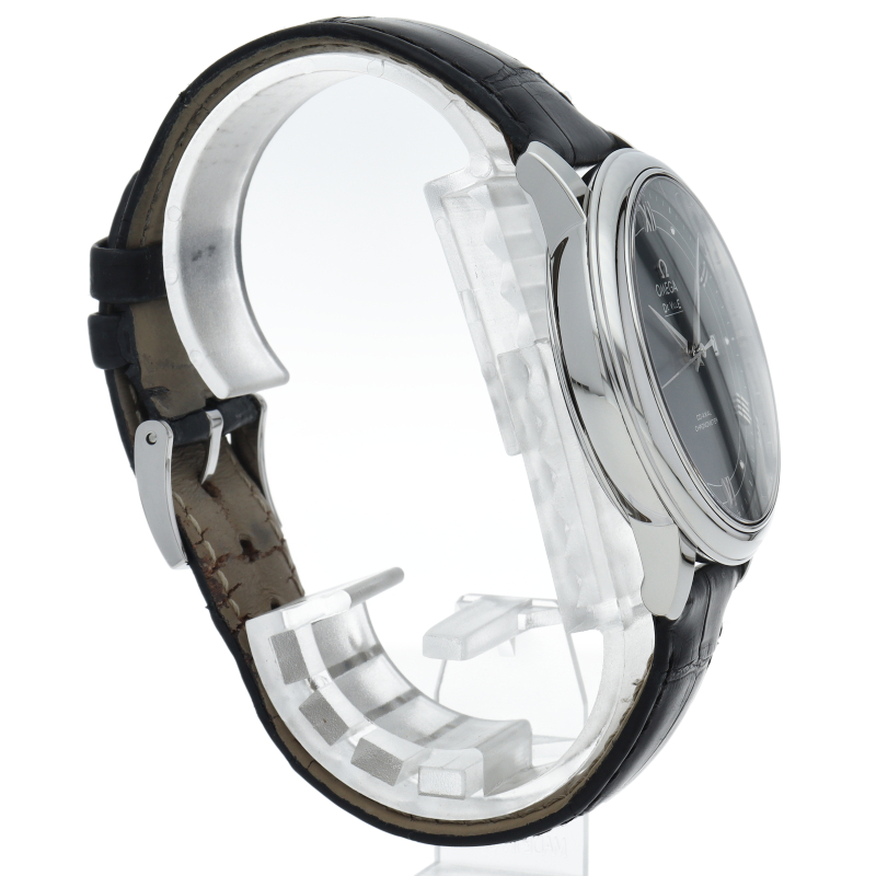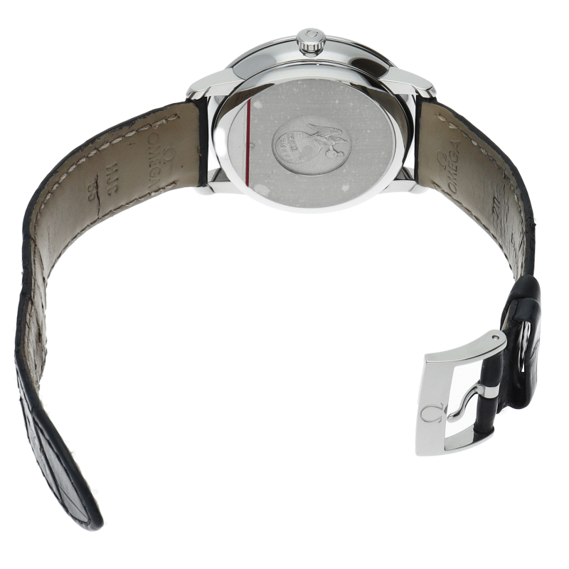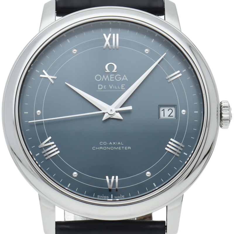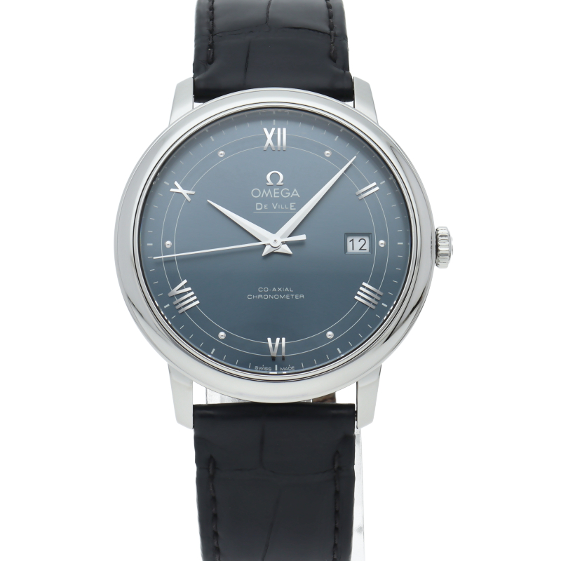 フランス語で「都会の」という意味をネーミングとしたコレクションが「デ・ヴィル」です。高精度と高耐久性を誇るコーアクシャル・エスケープメントを搭載したオメガのラグジュアリーモデルです。プレステージはデ・ヴィルのスタンダード仕様。日付表示のみというシンプルな構成となります。オメガ自社製自動巻きムーブメント・オメガ2500を搭載しています。
