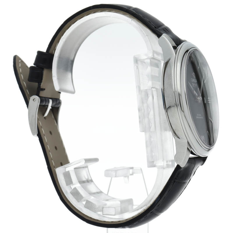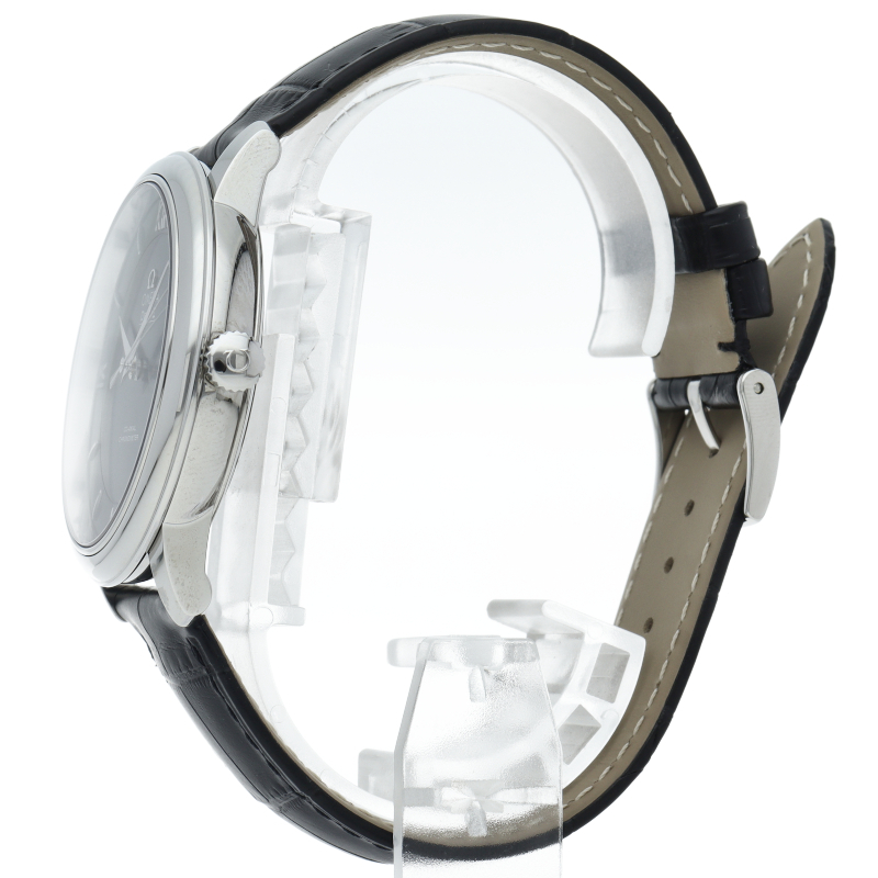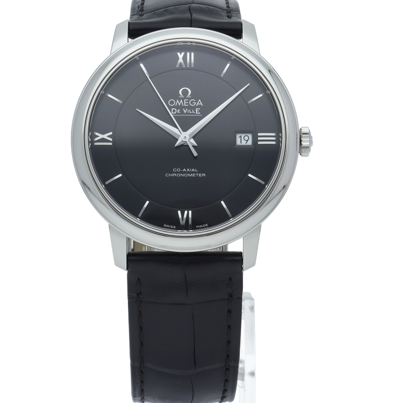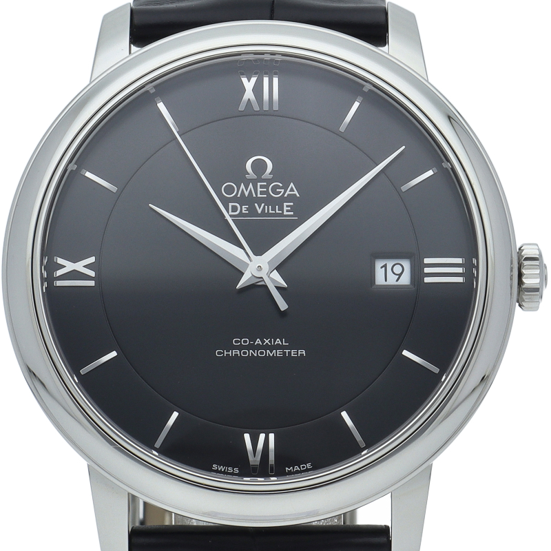 フランス語で「都会の」という意味をネーミングとしたコレクションが「デ・ヴィル」です。高精度と高耐久性を誇るコーアクシャル・エスケープメントを搭載したオメガのラグジュアリーモデルです。プレステージはデ・ヴィルのスタンダード仕様。日付表示のみというシンプルな構成となります。オメガ自社製自動巻きムーブメント・オメガ2500を搭載しています。