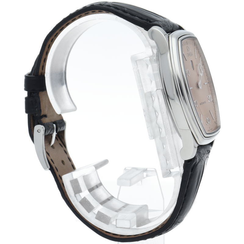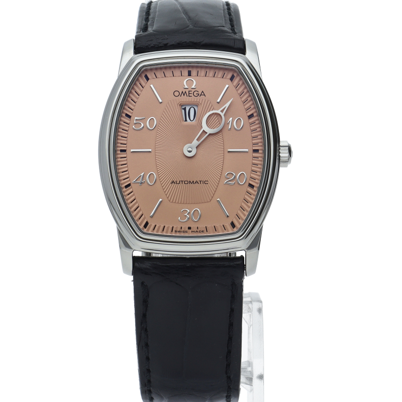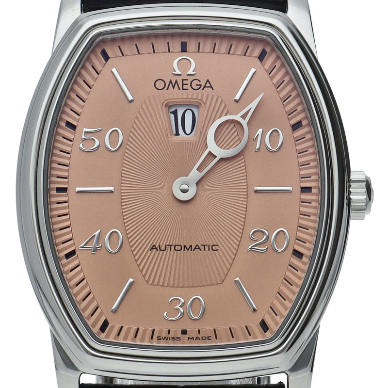 オメガのデ・ヴィル。こちらのモデルは、秒針が無く、針が分針のみで12時側の窓の数字が1~12時を表しています。現在は生産は終了し、出回っている数も非常に少ない希少性の高いモデルです。