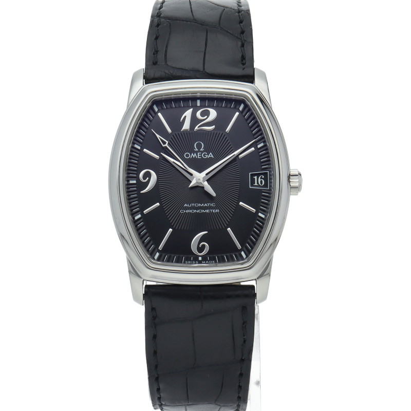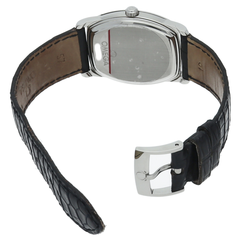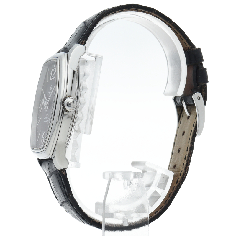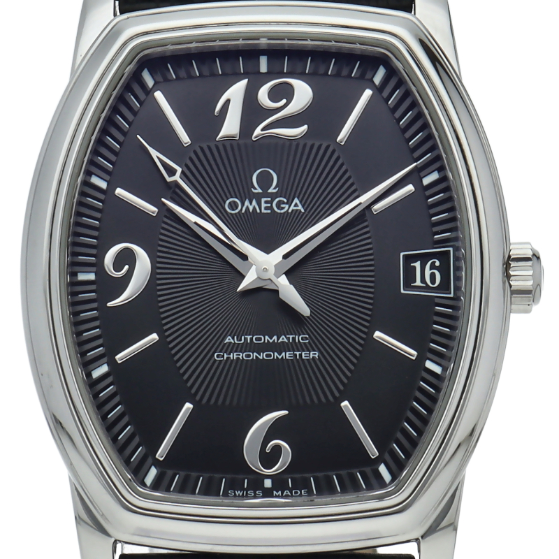 文字盤の形としては第3の定番ともいえる、トノー型の腕時計です。全体の印象はあくまでエレガントで節度があり、「デ・ヴィル(=都会的な)」という名にふさわしい佇まいです。控えめながらも、袖口からちらりと覗くその姿には確かな知性と品格が宿っています。