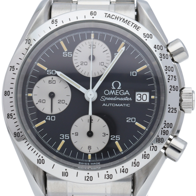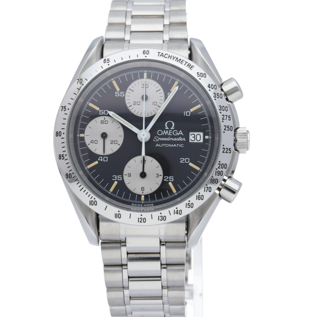 オメガの代表的な人気シリーズ「スピードマスター・デイト」。クロノグラフ・デイト表示機能付きと便利で実用性のある1本です。