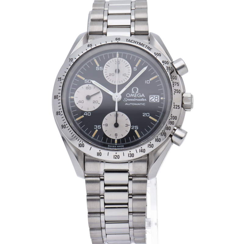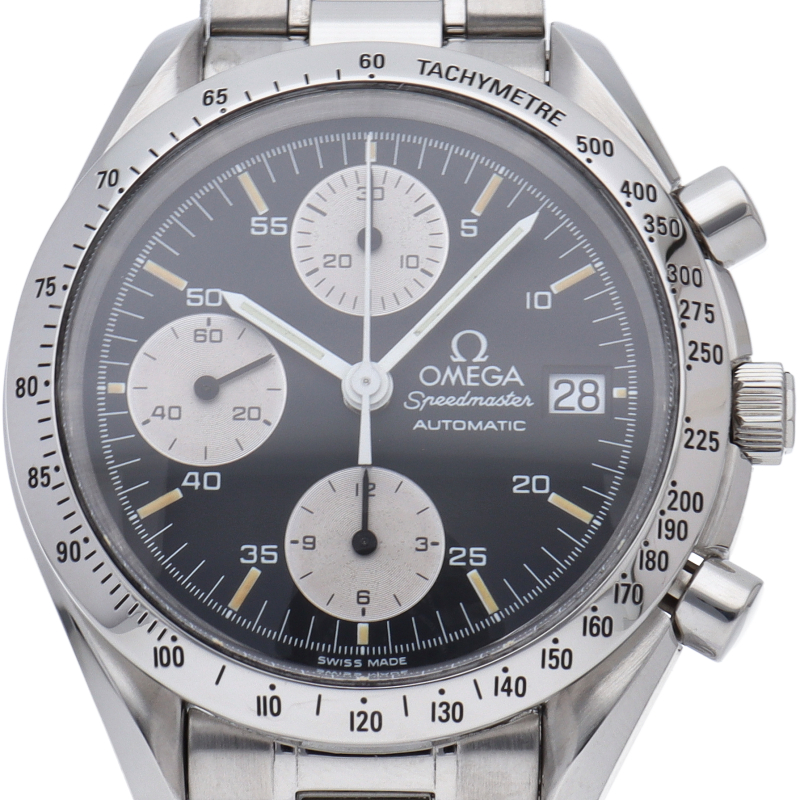 オメガの代表的な人気シリーズ「スピードマスター・デイト」。クロノグラフ・デイト表示機能付きと便利で実用性のある1本です。