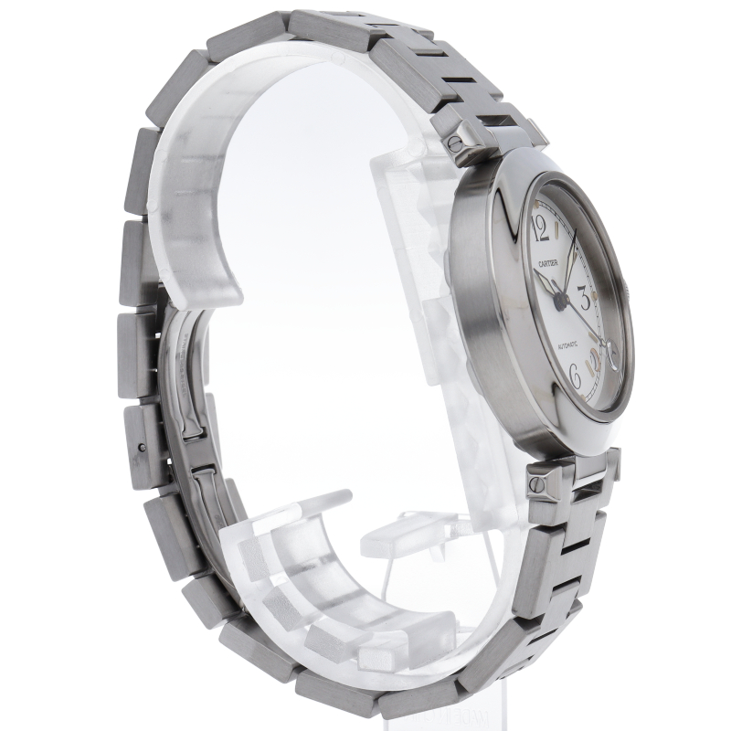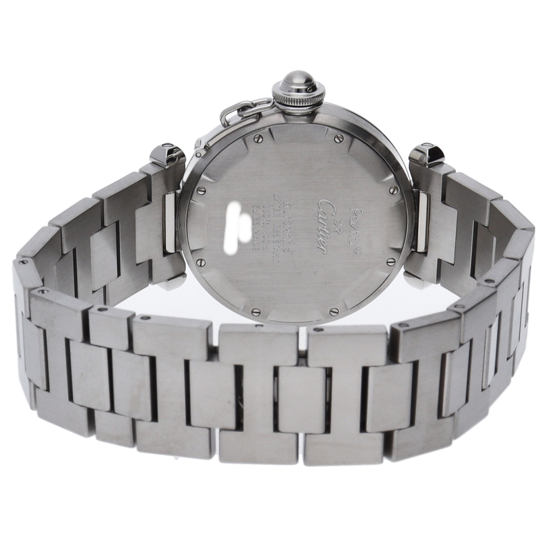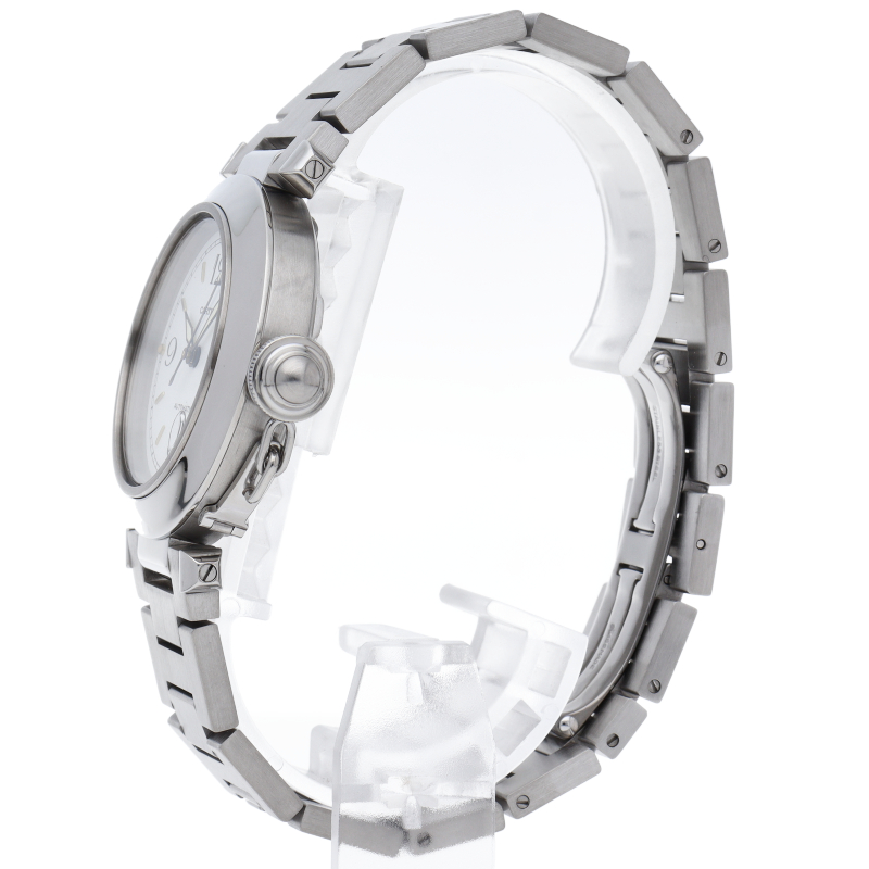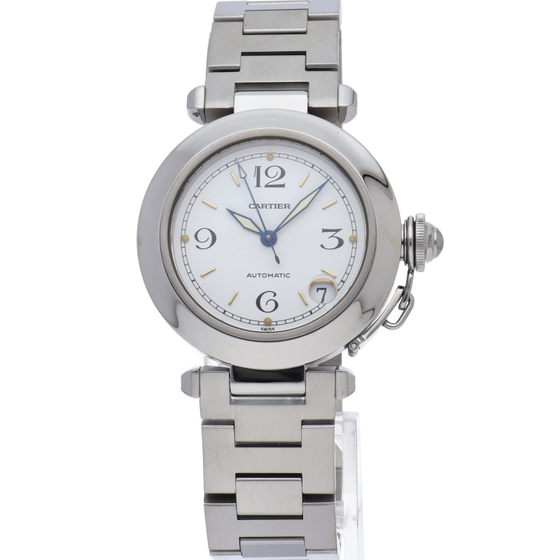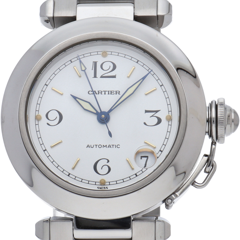 カルティエの人気パシャCシリーズ。4時と5時の間にデイト表示機能が付いた実用性のある1本。どんなシーンにも活用できるラウンドケースがオシャレです。