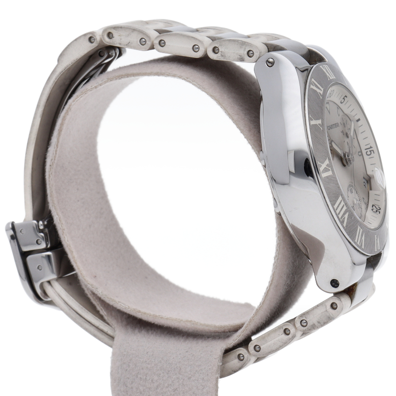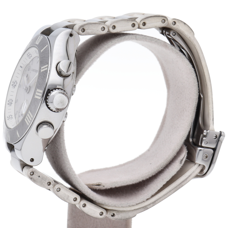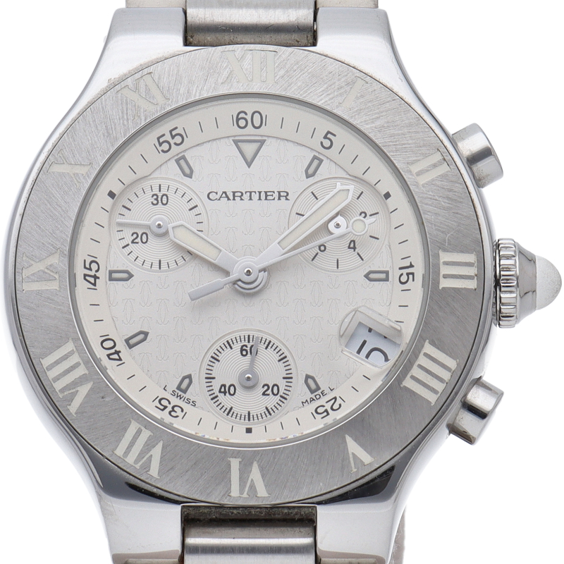 カルティエのエレガントかつ上品なデザインで人気の「マスト21」。ブラックの文字盤にカルティエのロゴである2Cモチーフがあしらわれ、ブラックラバーのストラップが渋い逸品です。
