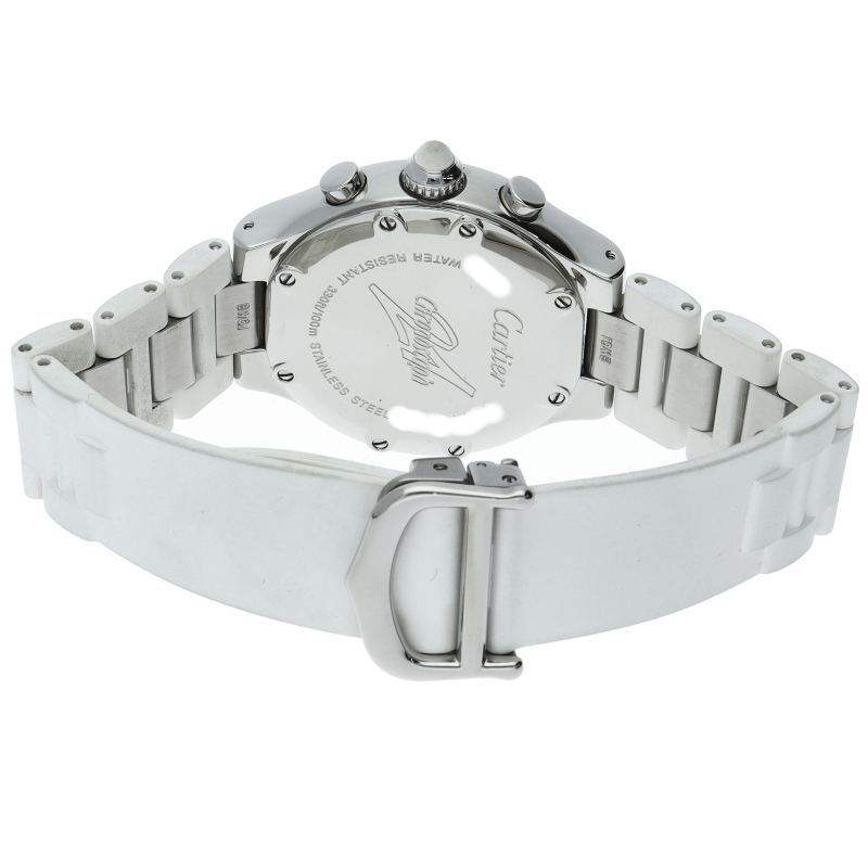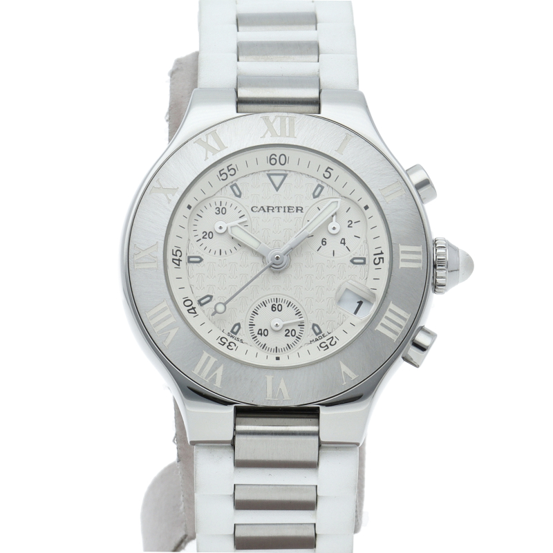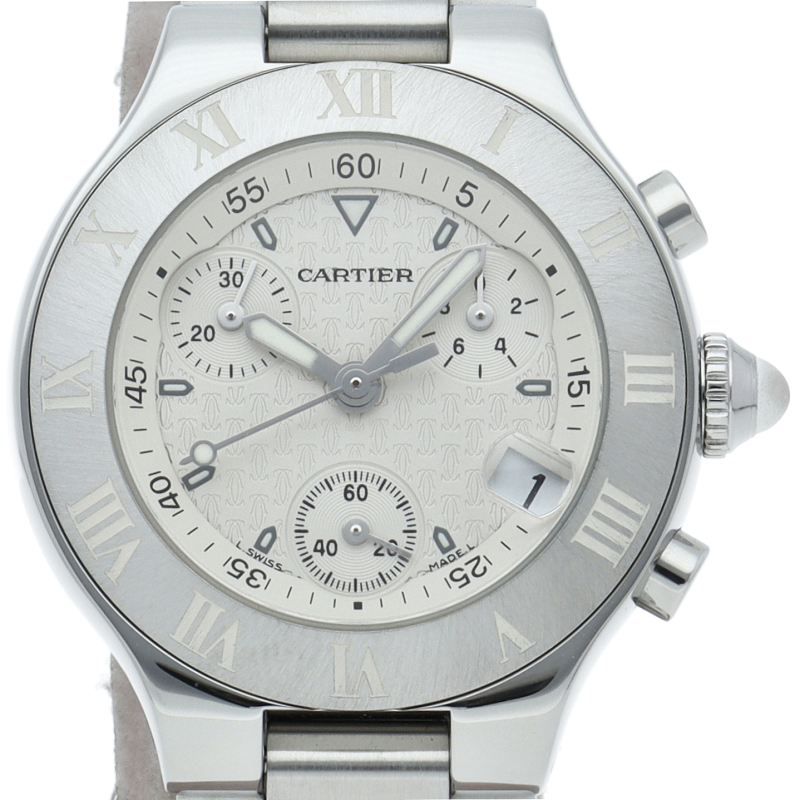 カルティエのエレガントかつ上品なデザインで人気の「マスト21」。ブラックの文字盤にカルティエのロゴである2Cモチーフがあしらわれ、ブラックラバーのストラップが渋い逸品です。