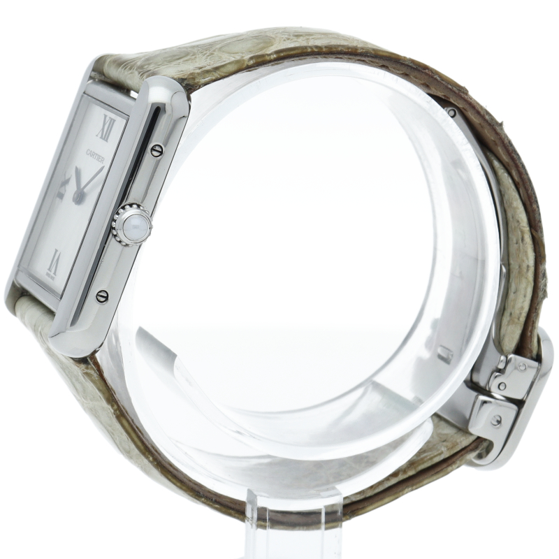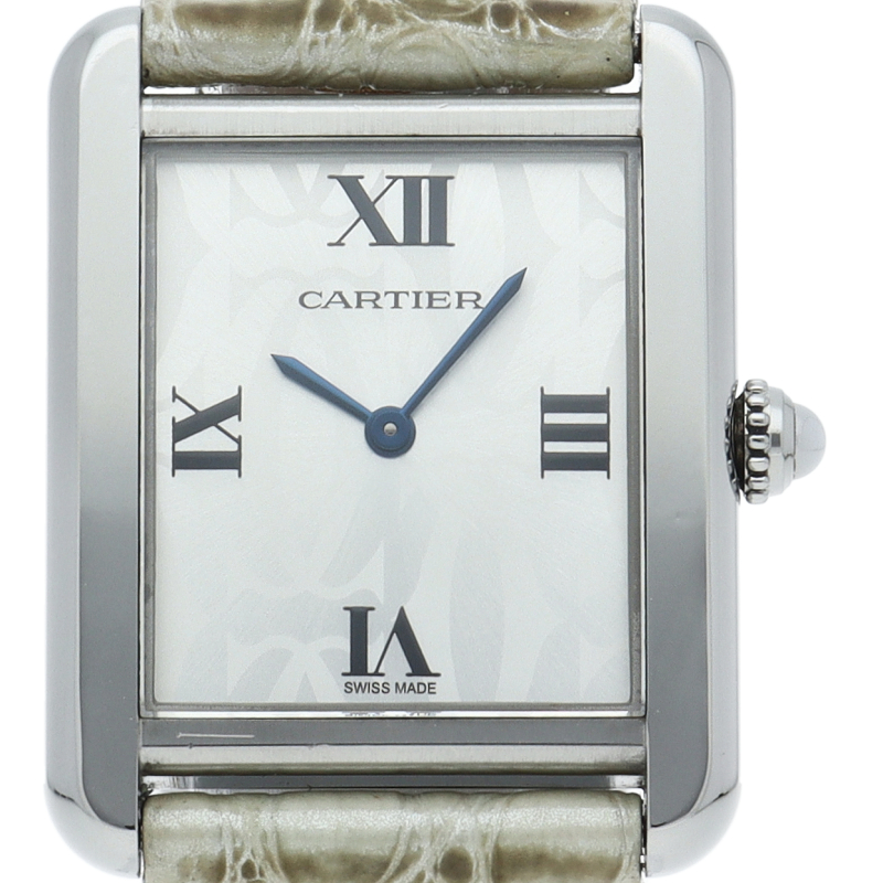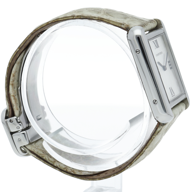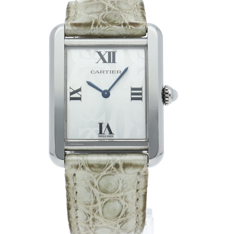 2006年のクリスマスに限定発売されたモデル。カルティエを代表する角形ウォッチ、タンクシリーズの中でもタンクソロはシンプルで飽きのこないデザインで人気があります。シンプルな角型ケースにカルティエのロゴマークを配したシルバーのダイアルが収められています。