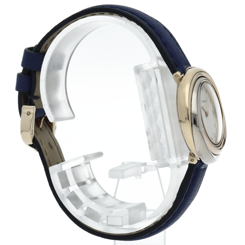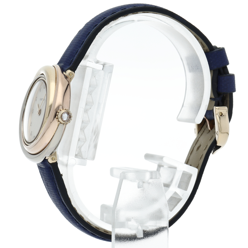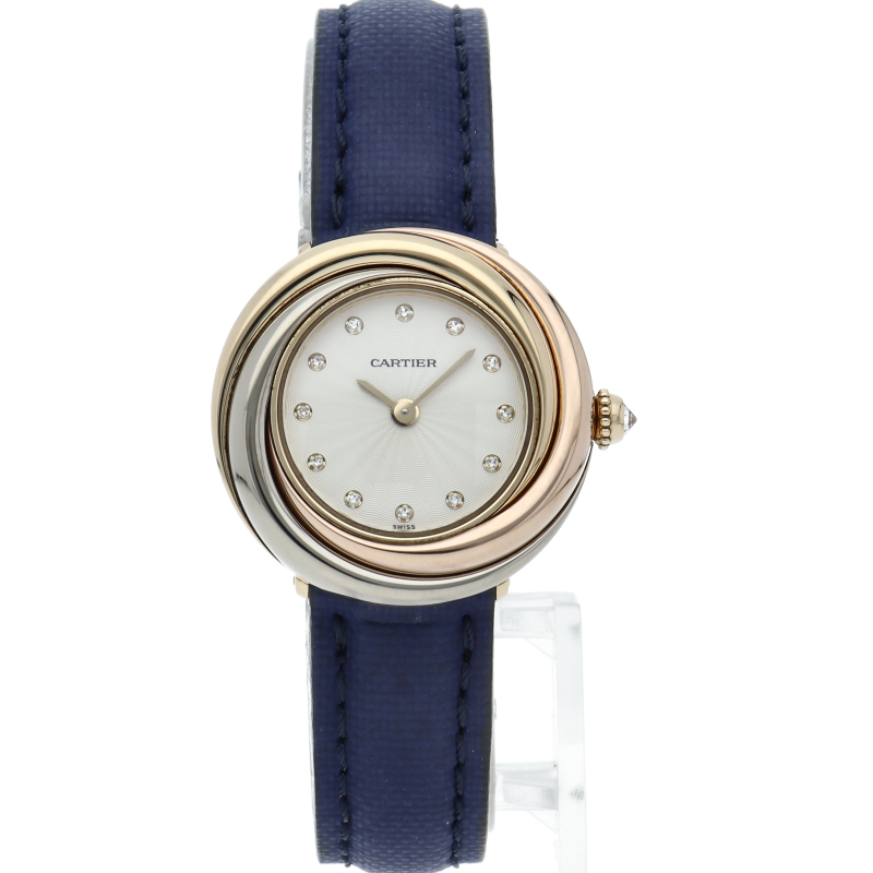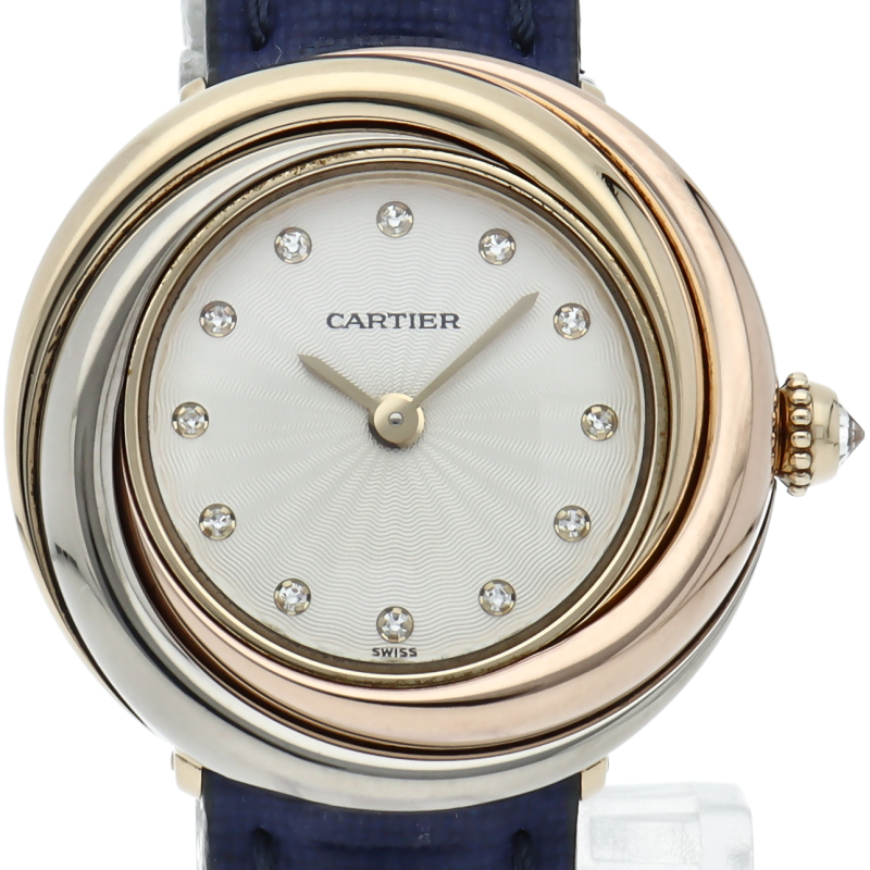 三連リングのデザインが特徴の、カルティエのジュエリーコレクション「トリニティ ドゥ カルティエ」。 現在はリングやネックレスのみの生産となっておりますが、以前は腕時計も生産されておりました。 ピンクゴールド・イエローゴールド・ホワイトゴールドの3本のリングが渦巻くようなケースデザインは、手間の掛かったモデルであることを感じさせます。