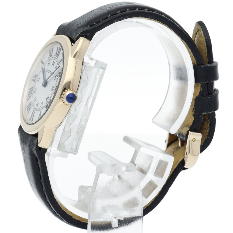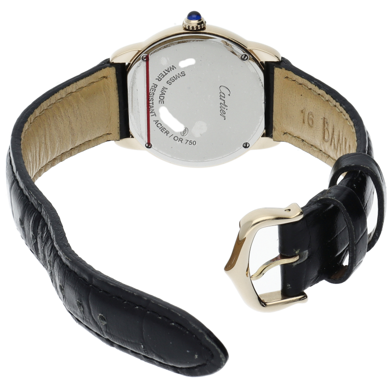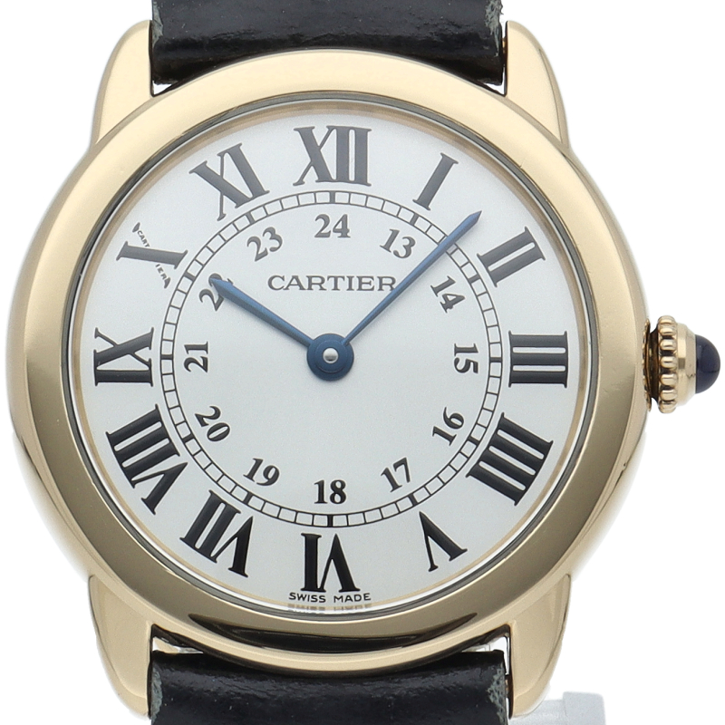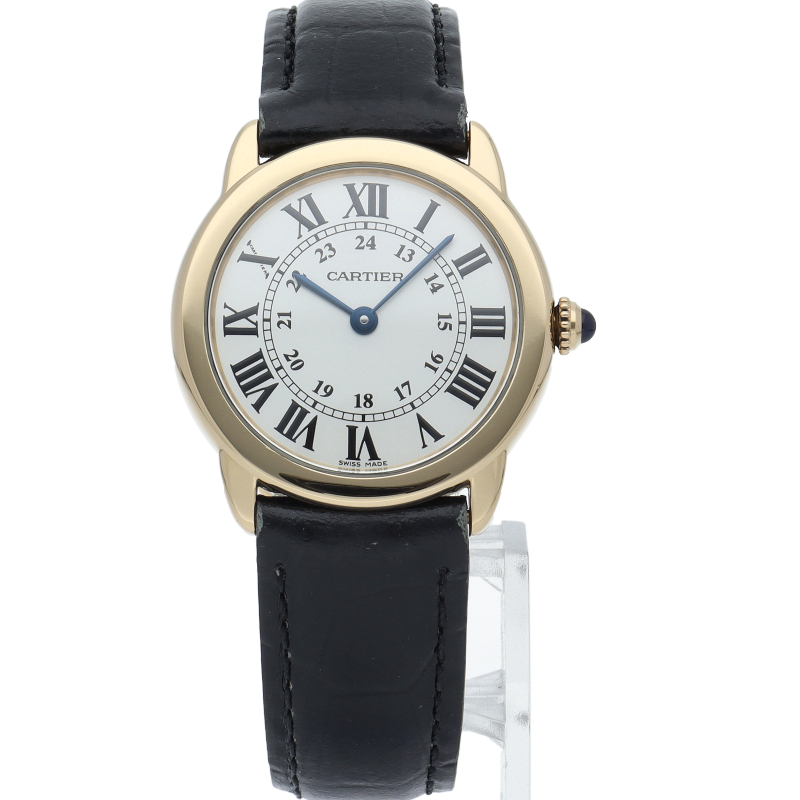 シンプルなデザインが人気の「ロンドソロ」。ブルースチールの針やローマンインデックスなどカルティエらしさが溢れています。